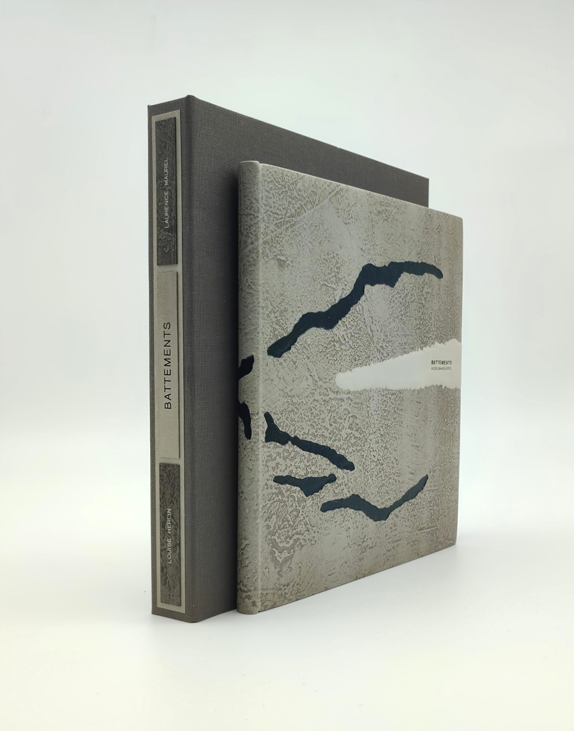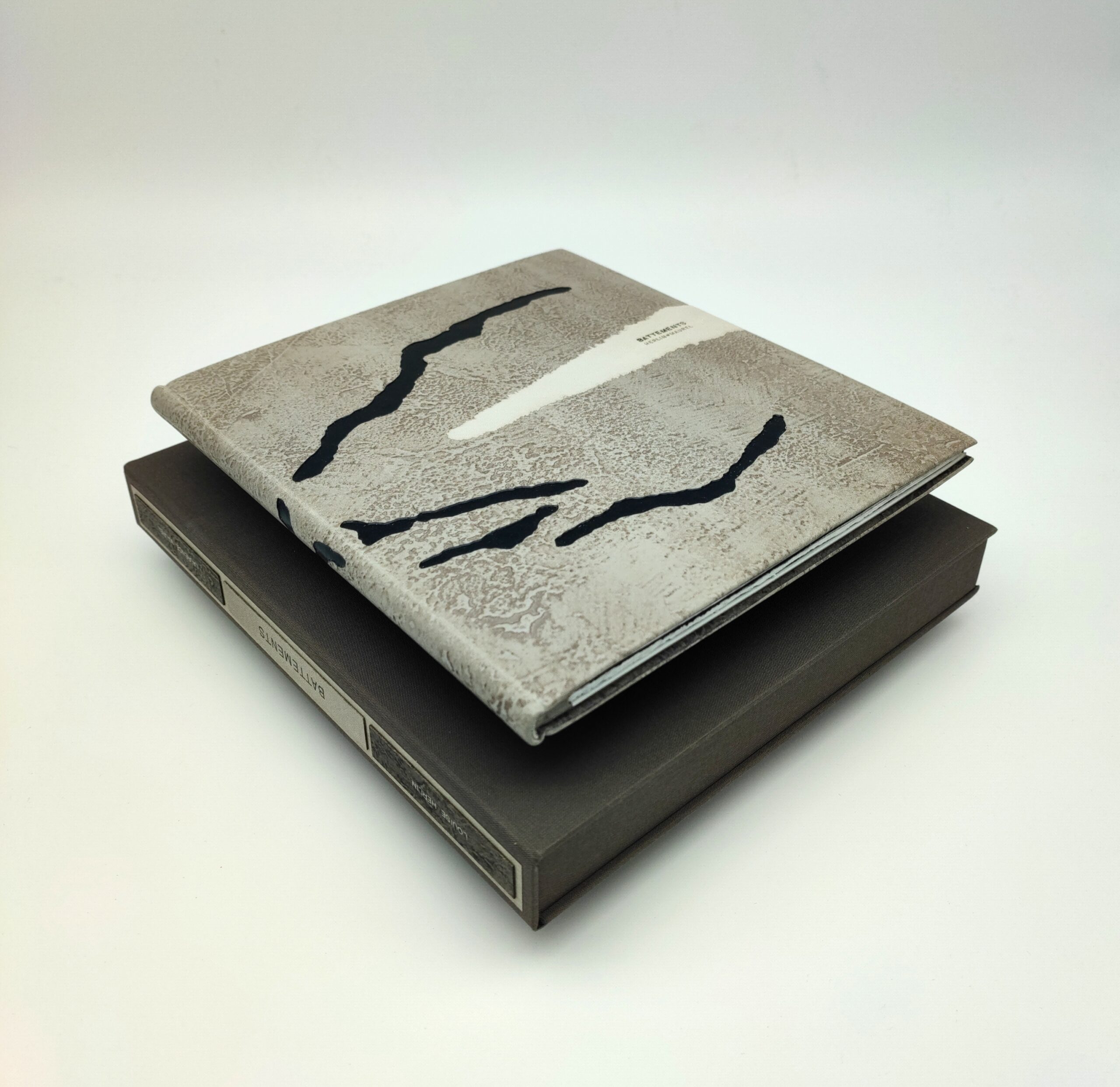 Laced-in boards binding with textured and dyed leather covers, decorated with onlays and incisions. Textured and dyed leather endleaves. One-of-a-kind binding.