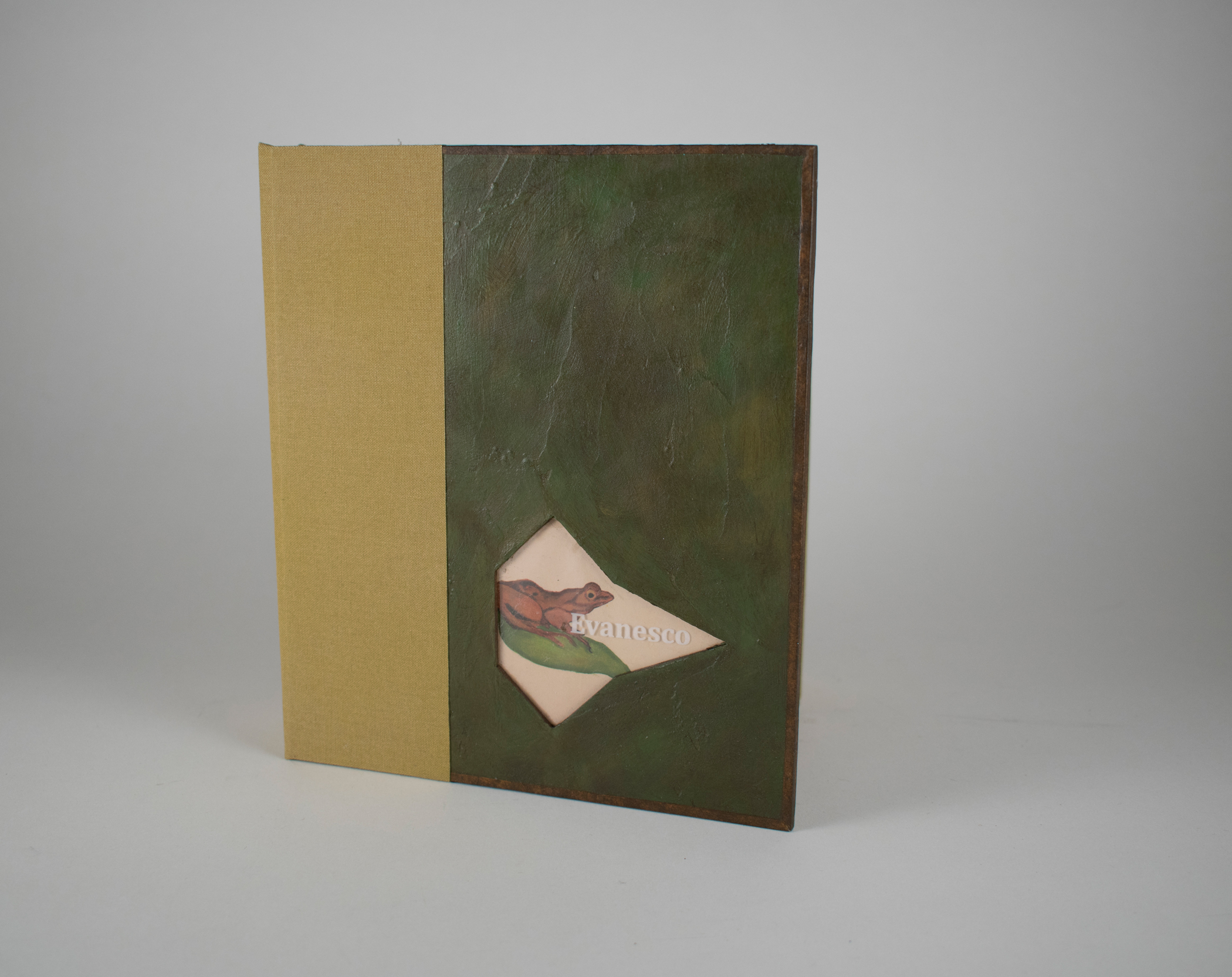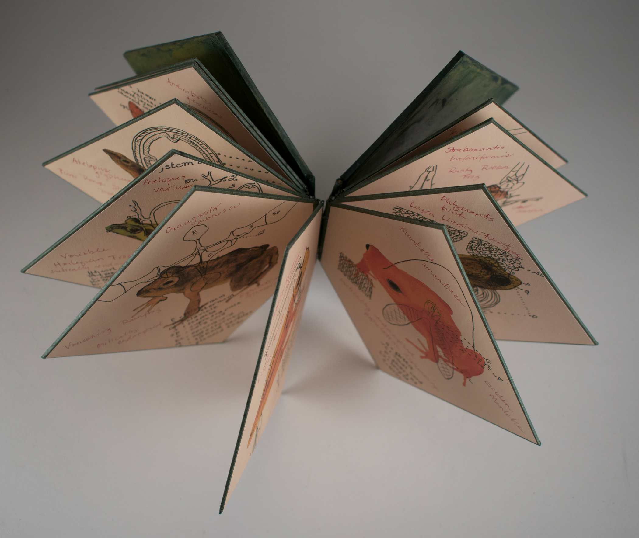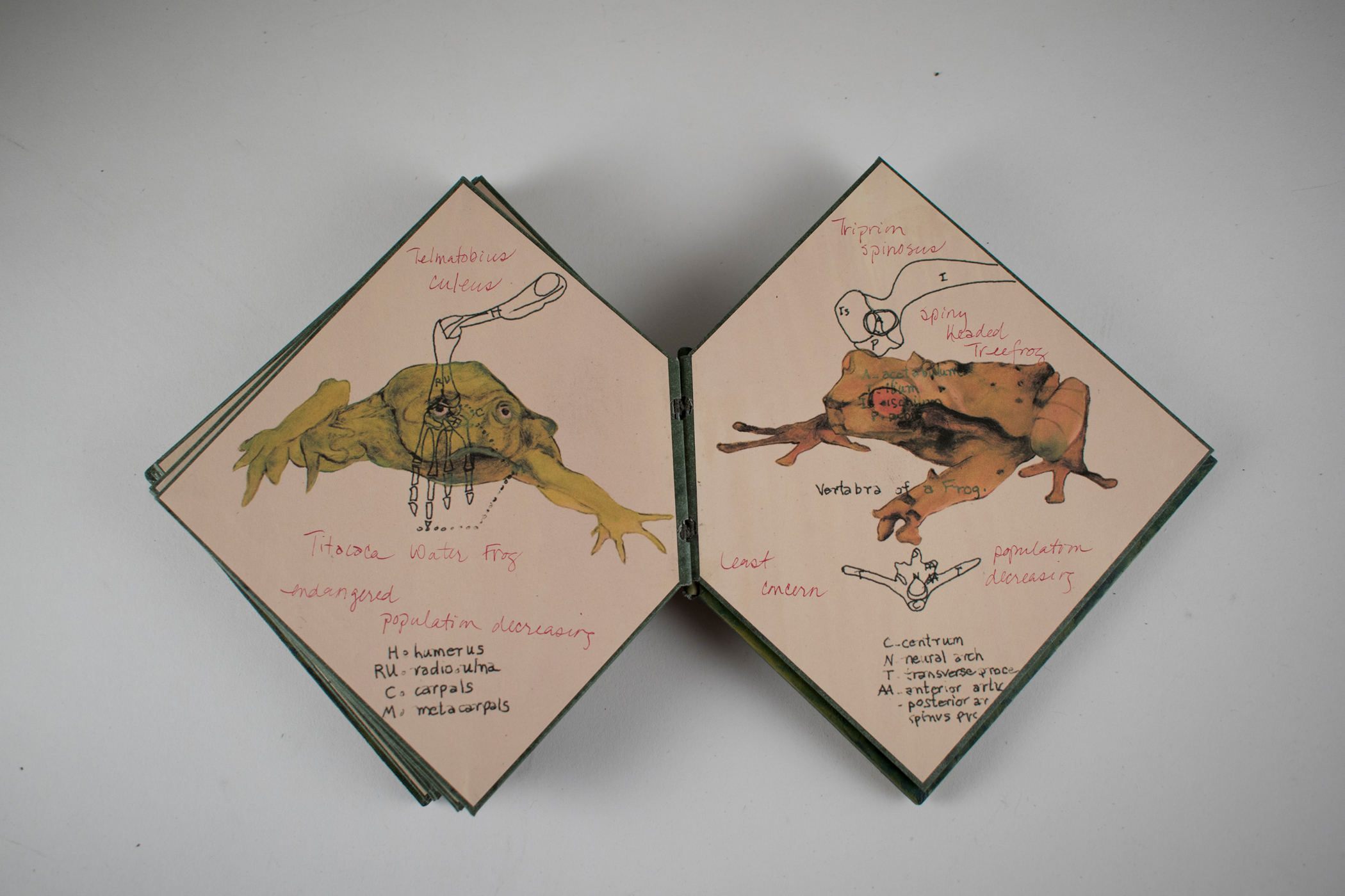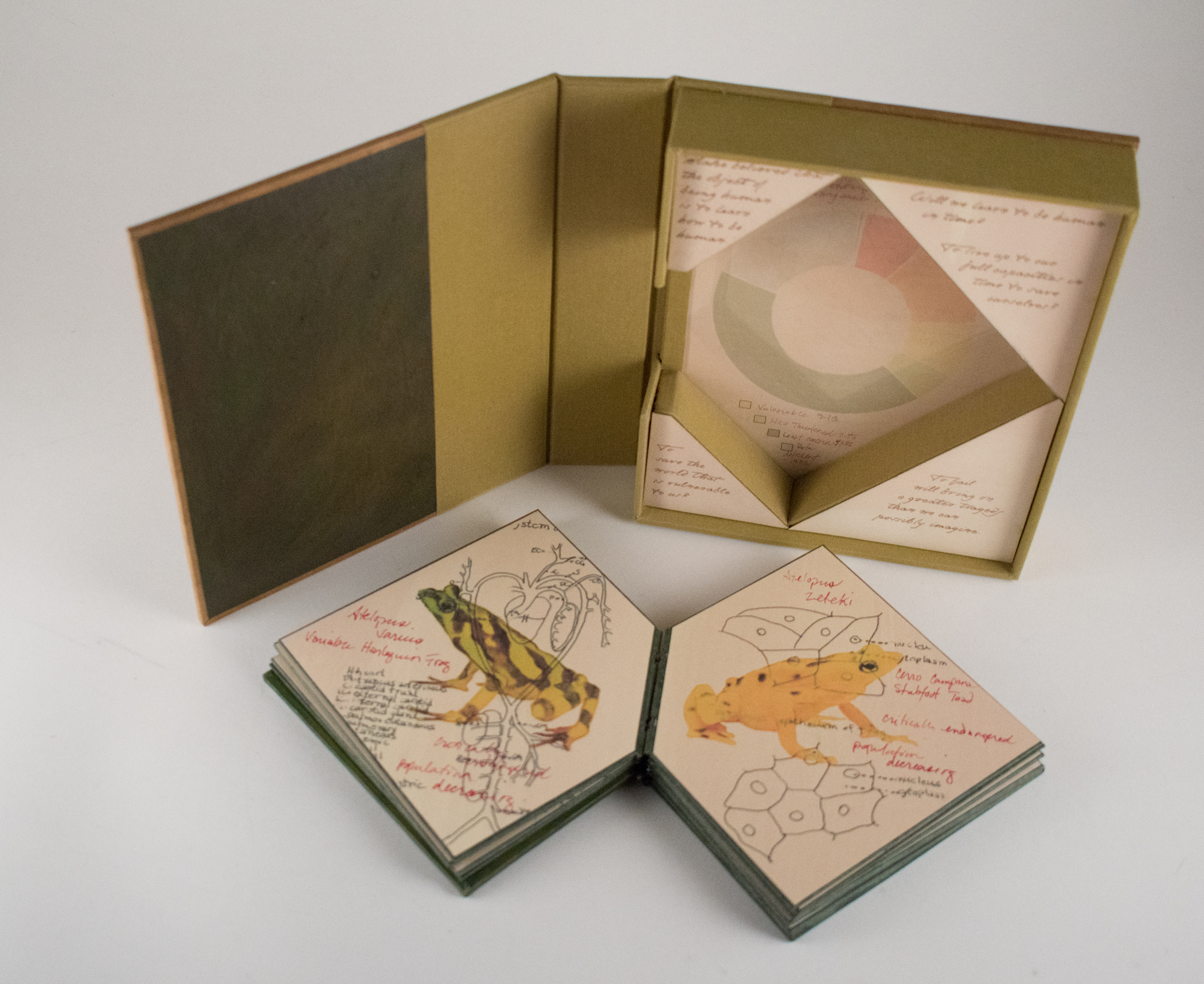 Wire edge book features 17 images of frogs with varying status from the IUCN Red List of Endangered species. The images are scanned and digitally printed from originals painted on century old biology notebook pages. The diamond shaped book is housed in a custom-box. The book and box covers each have an original oil painting of a frog behind an etched mica label.