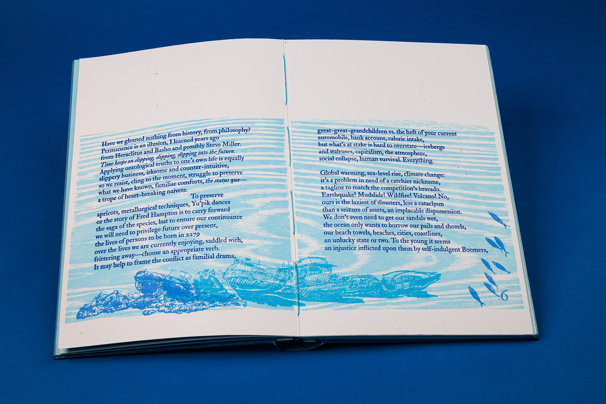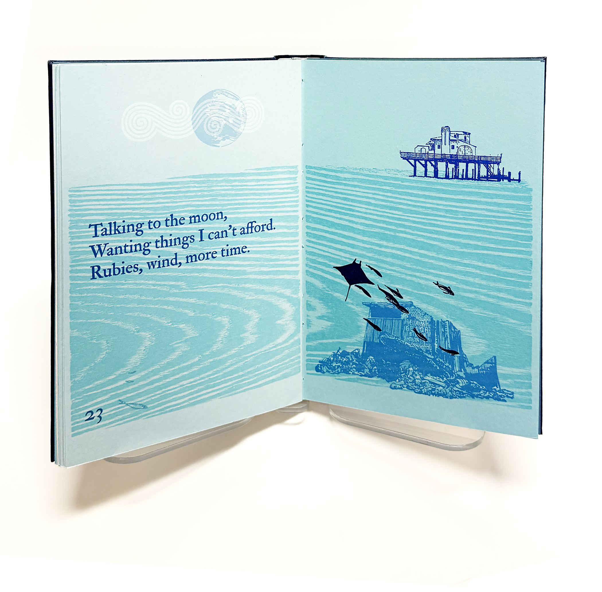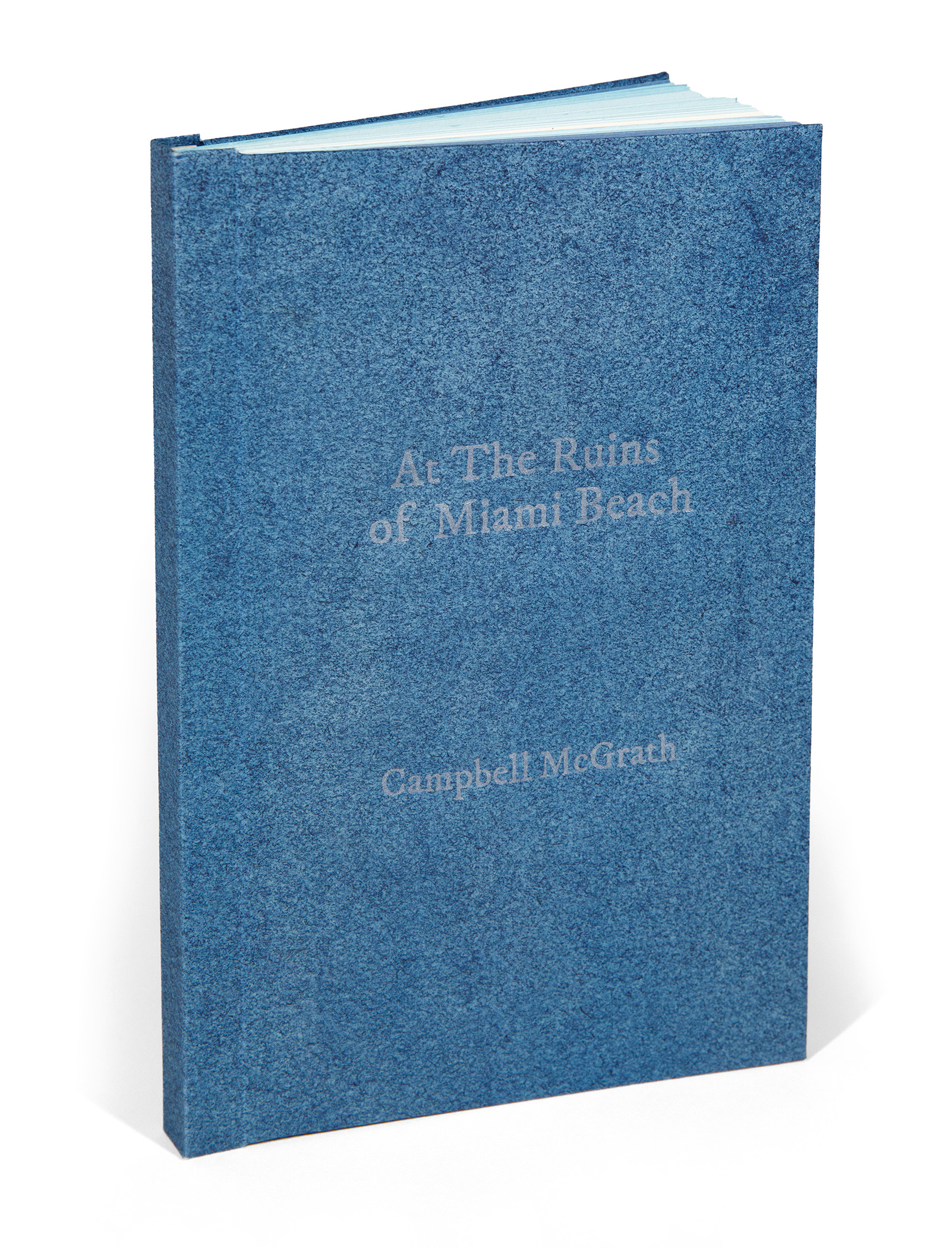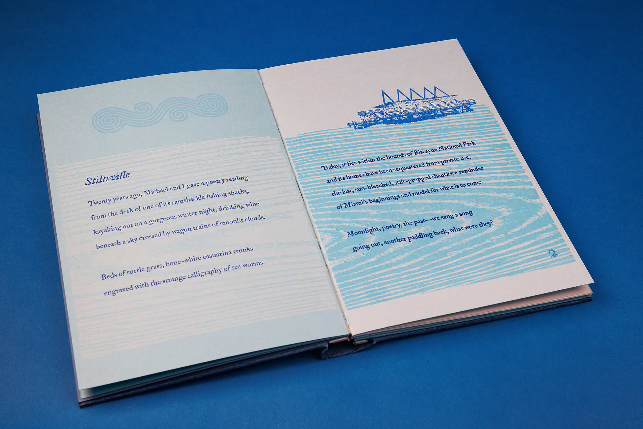 “At The Ruins of Miami Beach” was written by Campbell McGrath and designed and printed by Tom Virgin at Extra Virgin Press in Little Haiti (Miami) Florida. The book is letterpress printed from metal type, wood, linoleum plates, bamboo type ornaments, and polymer plates. The font used is IM Fell Double Pica PRO. The book is printed on French Paper (many Blues and a Speckletone True White) with a 1949 Vandercook 4 Proof Press. The binding is Karen Hanmer’s One-Piece Covering adaptation of Gary Frost’s sewn boards binding. The cover paper is vintage Cave Paper earned as an intern at Cave Paper in Minneapolis, Minnesota. Several earlier collaborations on broadsheets with McGrath led to a book that is a poetic journey through Miami Beach and the Atlantic Ocean. Both artists have deep ties to Miami Beach. The images in “Ruins” depict places both the artist and the poet share, as well as changes reflected in the book’s title.