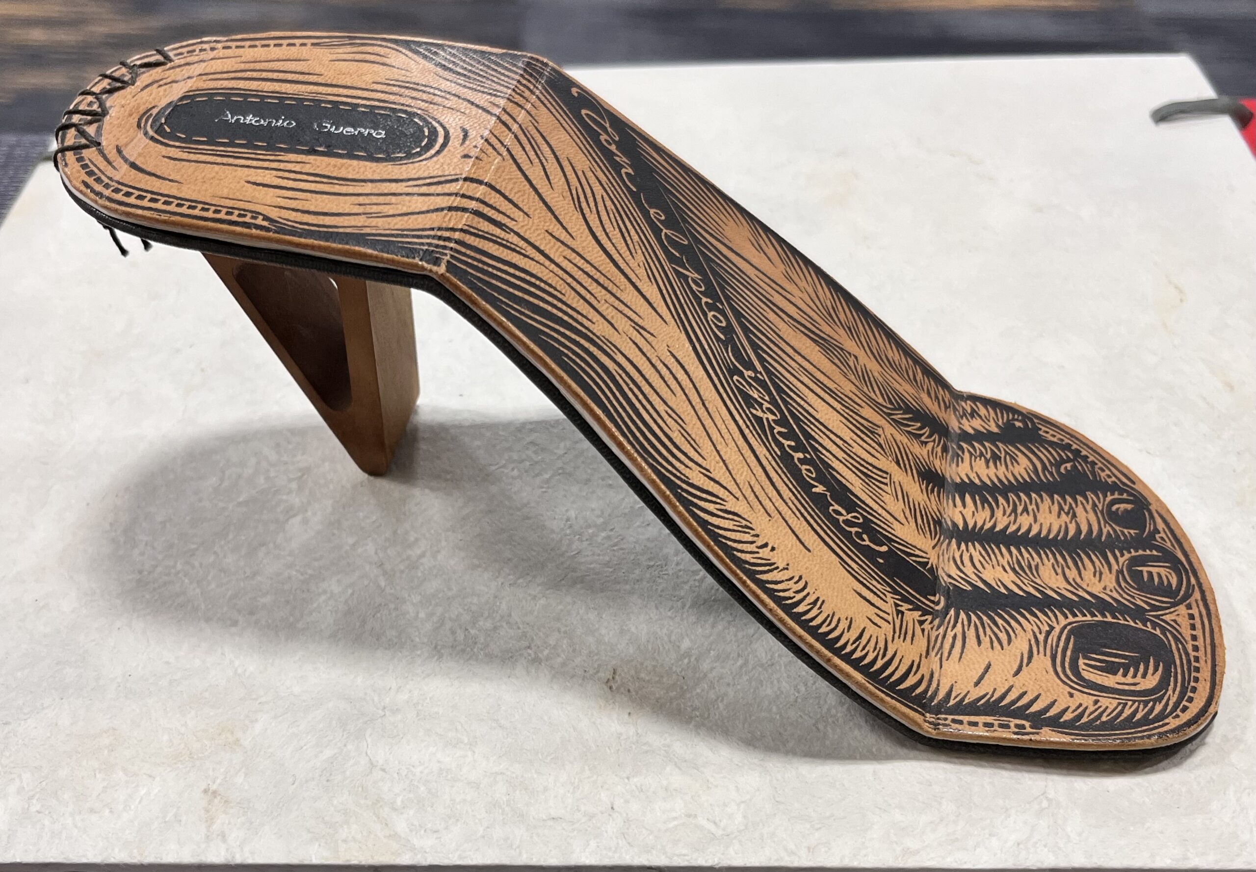 Book in the shape of a shoe/ short story written by Antonio Guerra on the style of visual poetry. Con el Pie izquierdo refers to a day when waking up on the wrong side of the bed.