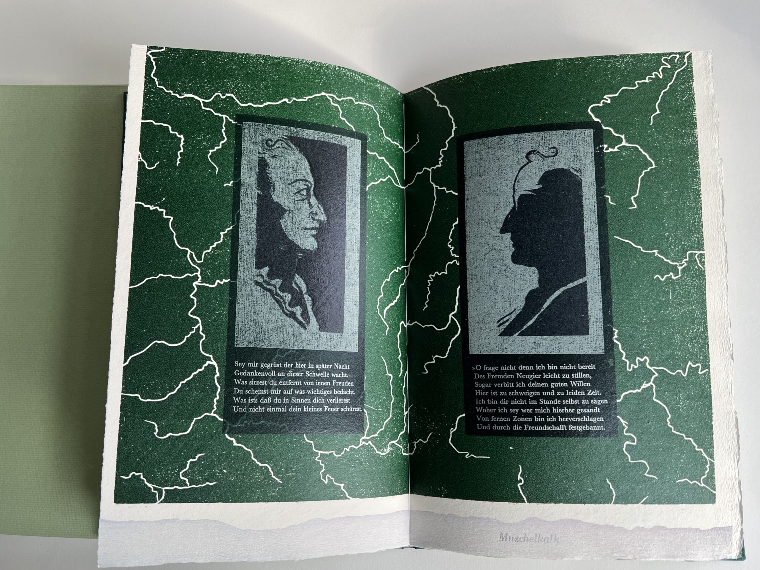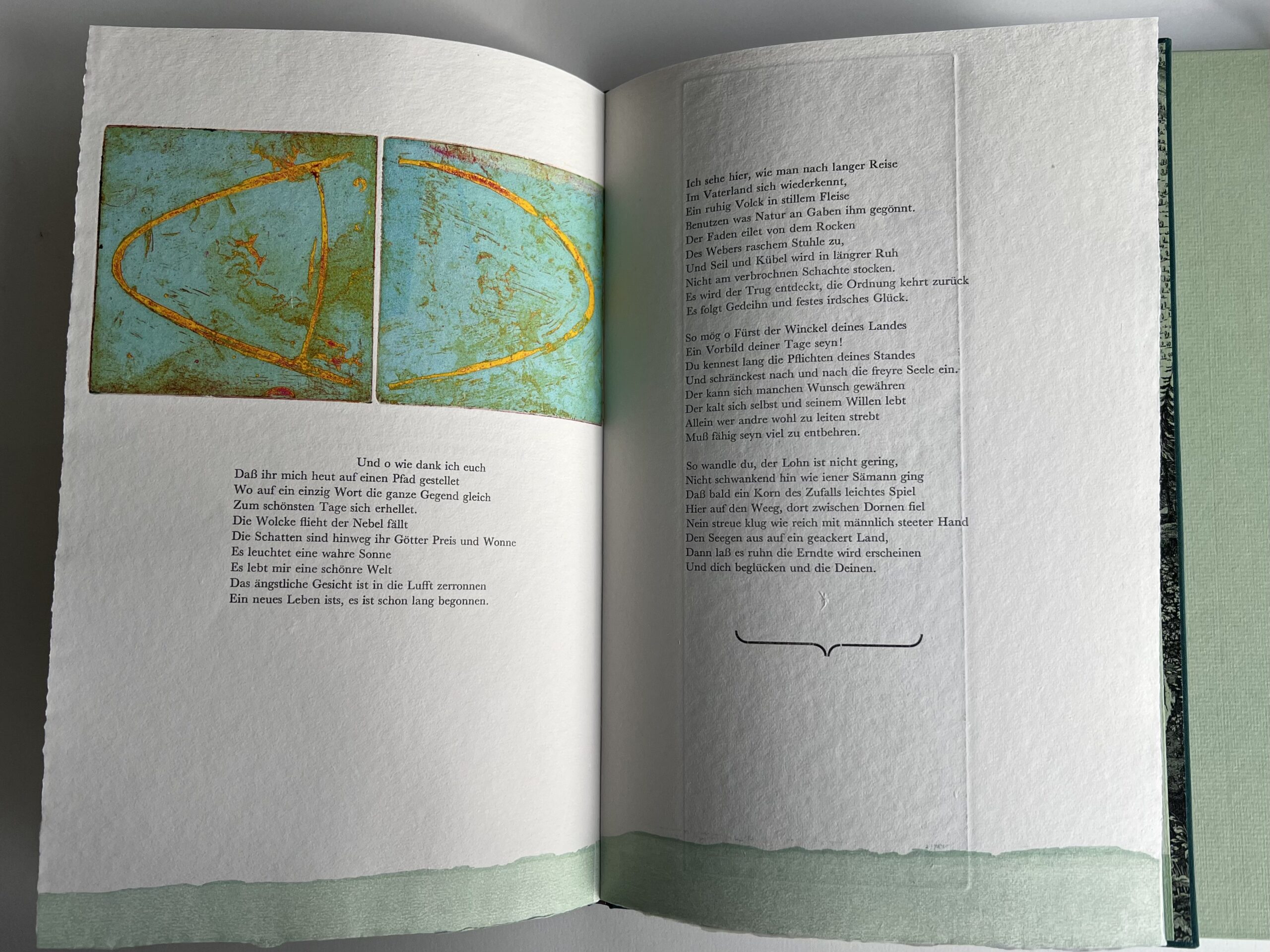 Artist‘s book employing letterpress, woodcut and simultaneous colour etching on handmade paper, traditionally bound in cloth with a slipcase. Approx. 33 x 20 cm (13“ x 8“).
