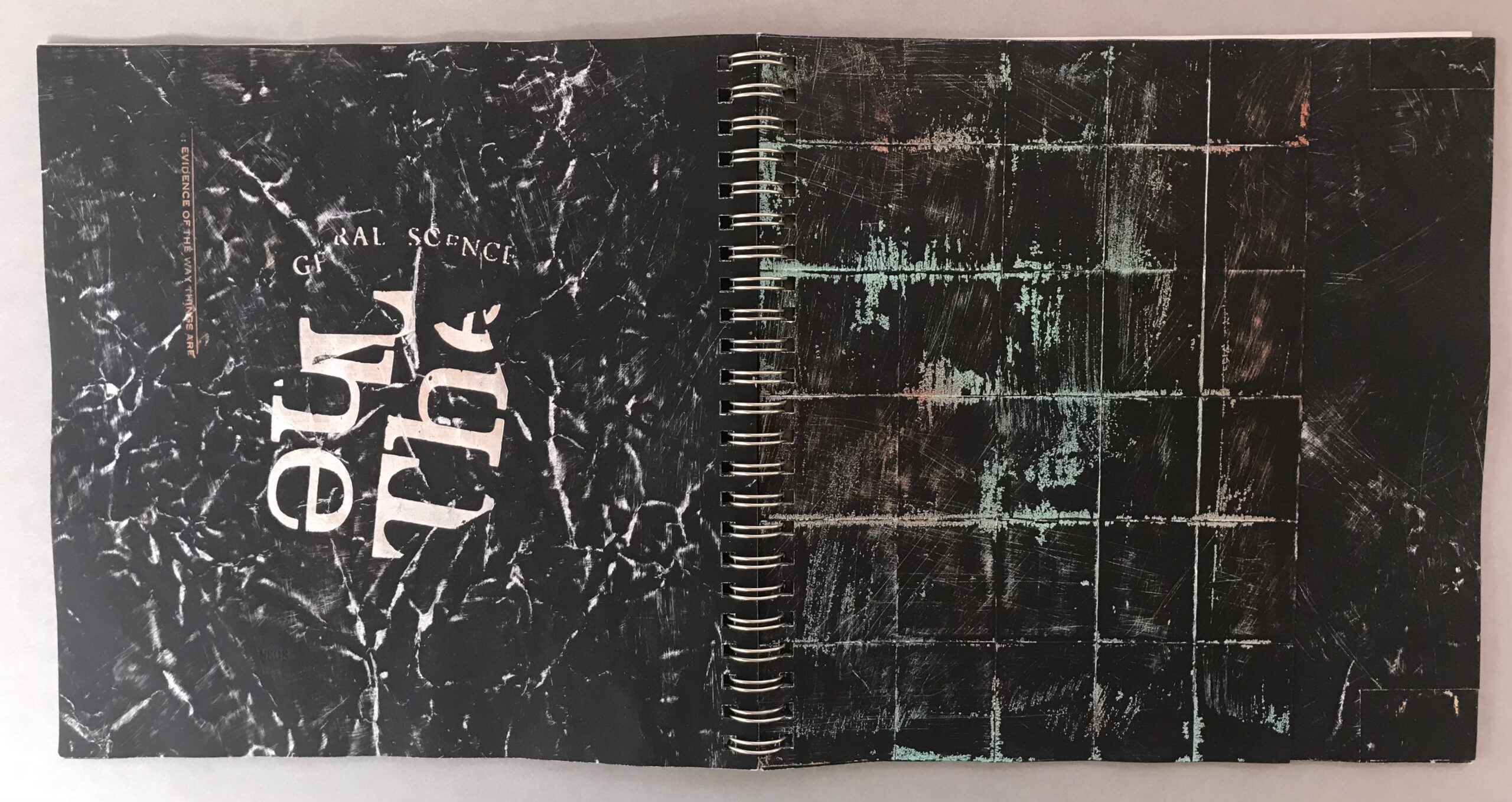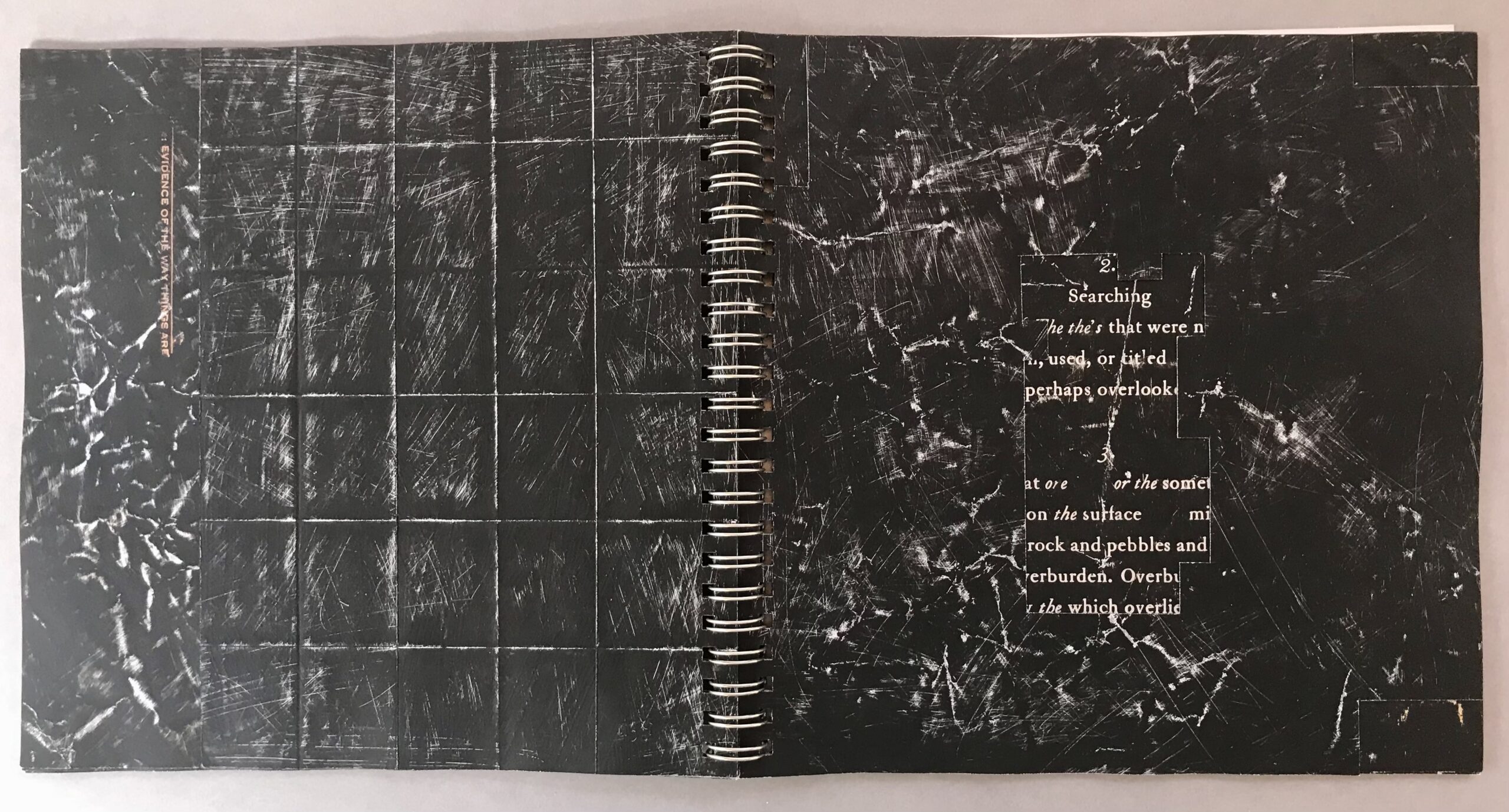 Artist Book with static shielding bag. 12 Varied Edition, each 8 x 8 x .25 inches (closed). Mixed Media: crumpled, gessoed, sanded and letterpress printed catalog pages from David Ireland catalog, “The Way Things Are”