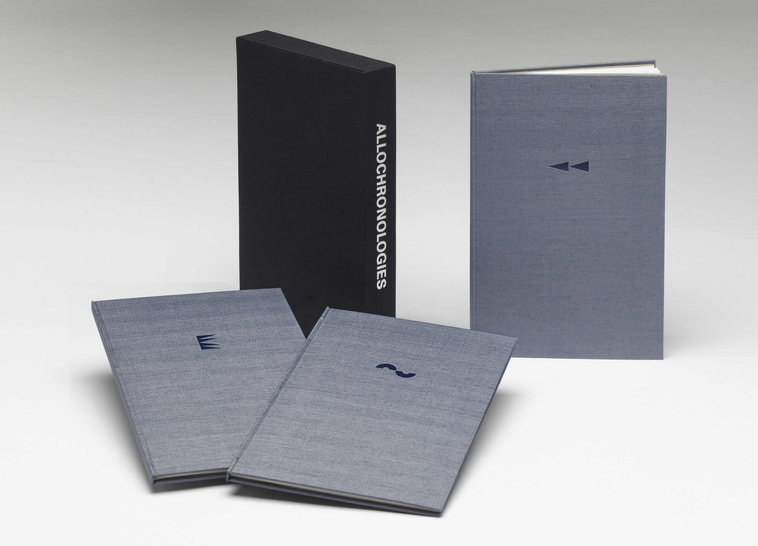 Allochronologies explores alternate notions of time, all conceivable according to the laws of science, that do not adhere to our ordinary experience. This piece takes some of the more surprising ideas of modern physics (multiple universes, a universe that oscillates, reversal of time’s arrow) and translates them into a multi-volume artist book. Each volume takes one kind of chronology and, using fragments of fiction by some of the great 20th century writers, creates a book that physically embodies that conception of time. Letterpress printed using Univers monotype and foundry type, images printed relief from polymer plates.