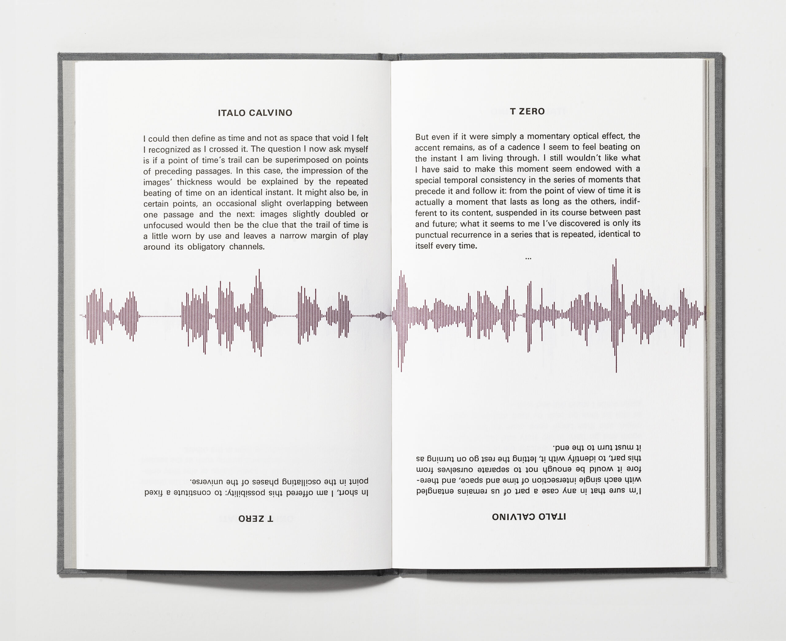 Edition of seventy-five: 15 deluxe three-volume sets lettered A-O, fifty three-volume sets numbered 1-50, and ten individual volumes numbered i-x. Excerpted texts include “April March” from “A Survey of the Works of Herbert Quain” by Jorge Luis Borges, (1941), translated by Andrew Hurley; “t zero” by Italo Calvino (1967), translated by William Weaver; and “2 June 1905” from Einstein’s Dreams by Alan Lightman (1993). Deluxe copies bound by Shelter Bookworks, Orange, Massachusetts. Standard copies bound by Sarah Hulsey Studios with production work by Sihan Mia Zhu. Dimensions: 10” x 6.75” x 1.75”