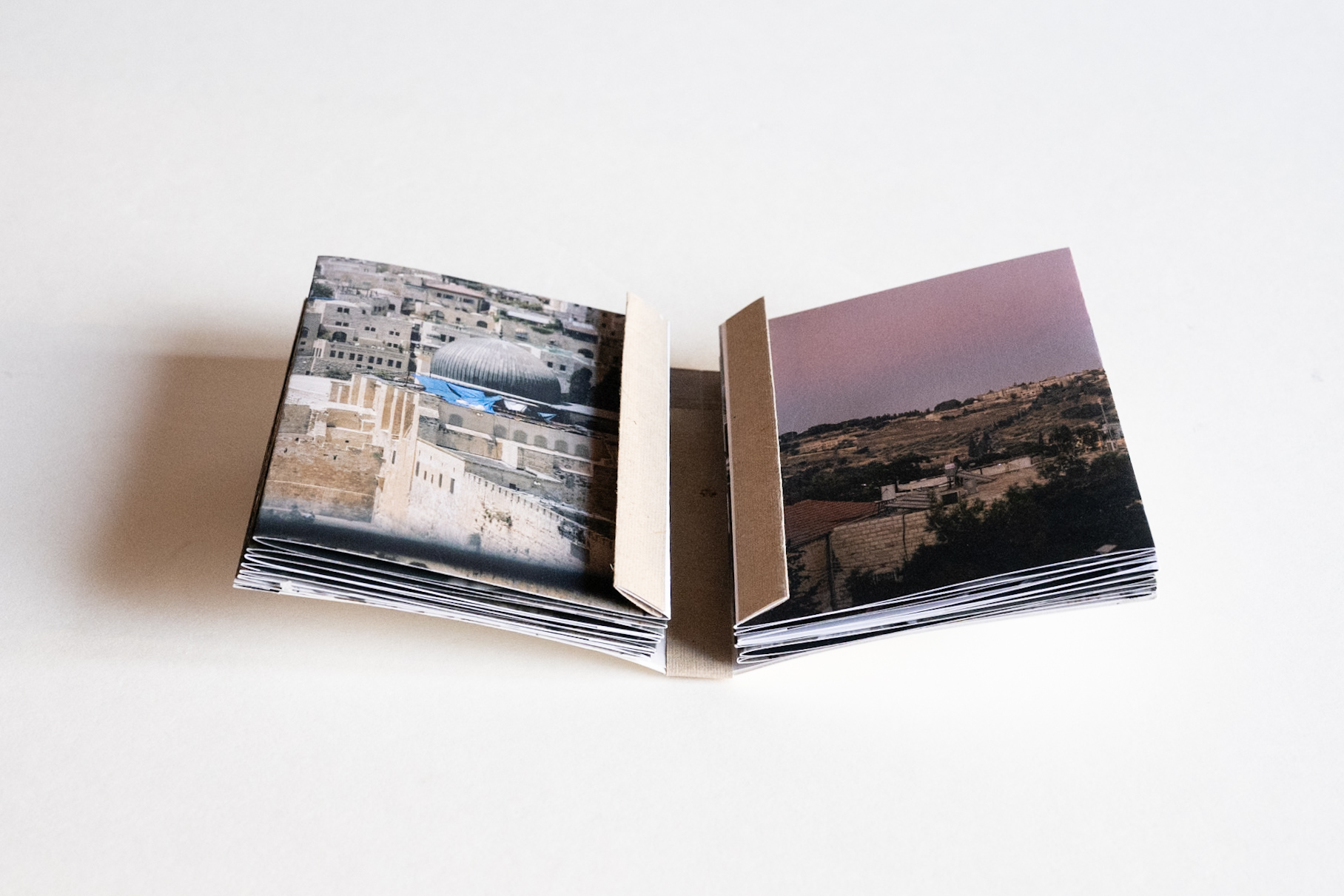 Details of book-structure: The book comprises of two accordions which forms a wall with one opening. Close-up portraits of pilgrims of three different religion on the inside flaps of the accordion as it opens from both sides. The outside of the accordion depicts the walled city of Jerusalem using the photo collage of the religious sites. The joint of the accordion carries the scriptures from the Quran (Arabic), the Bible and the Torah (Hebrew).