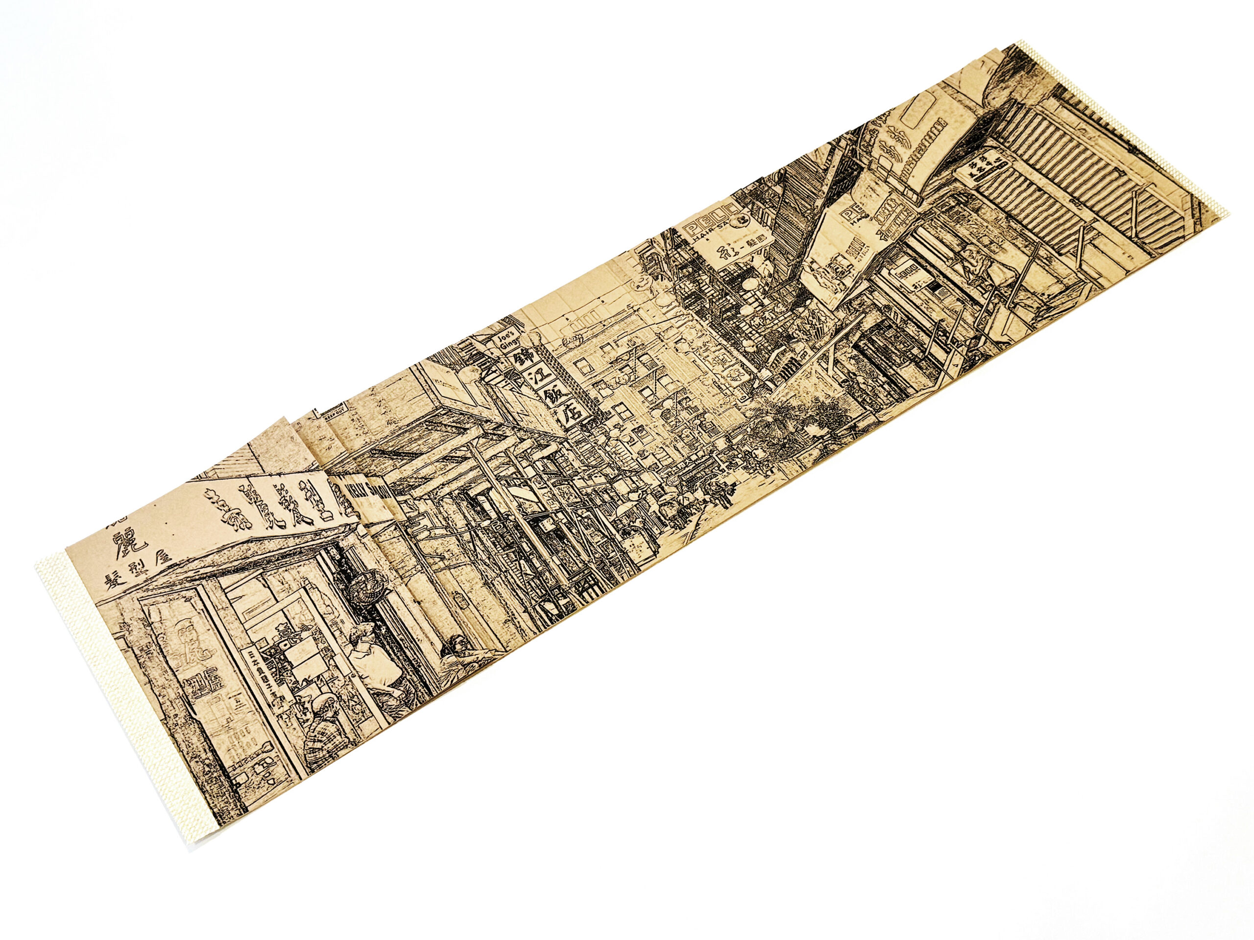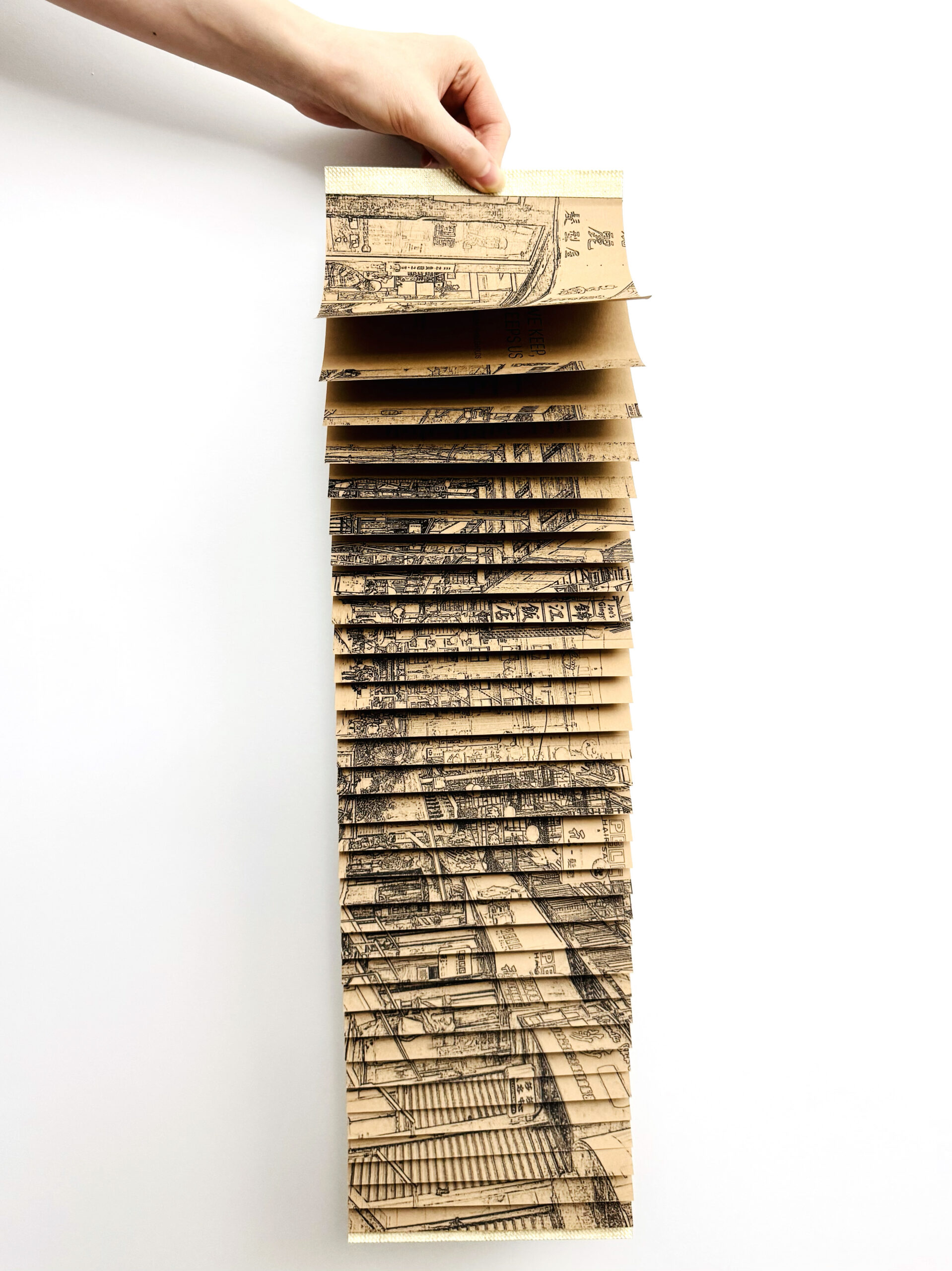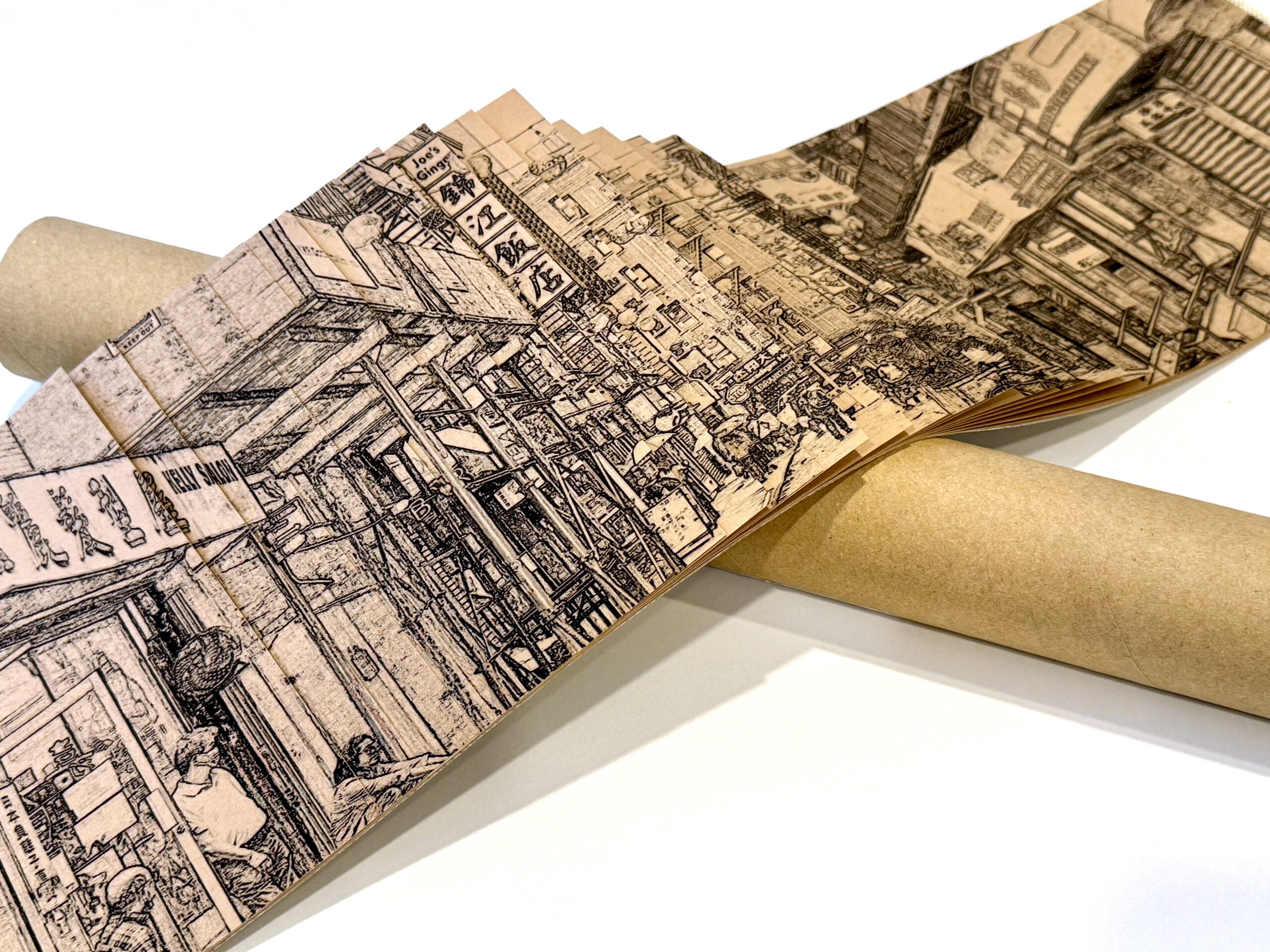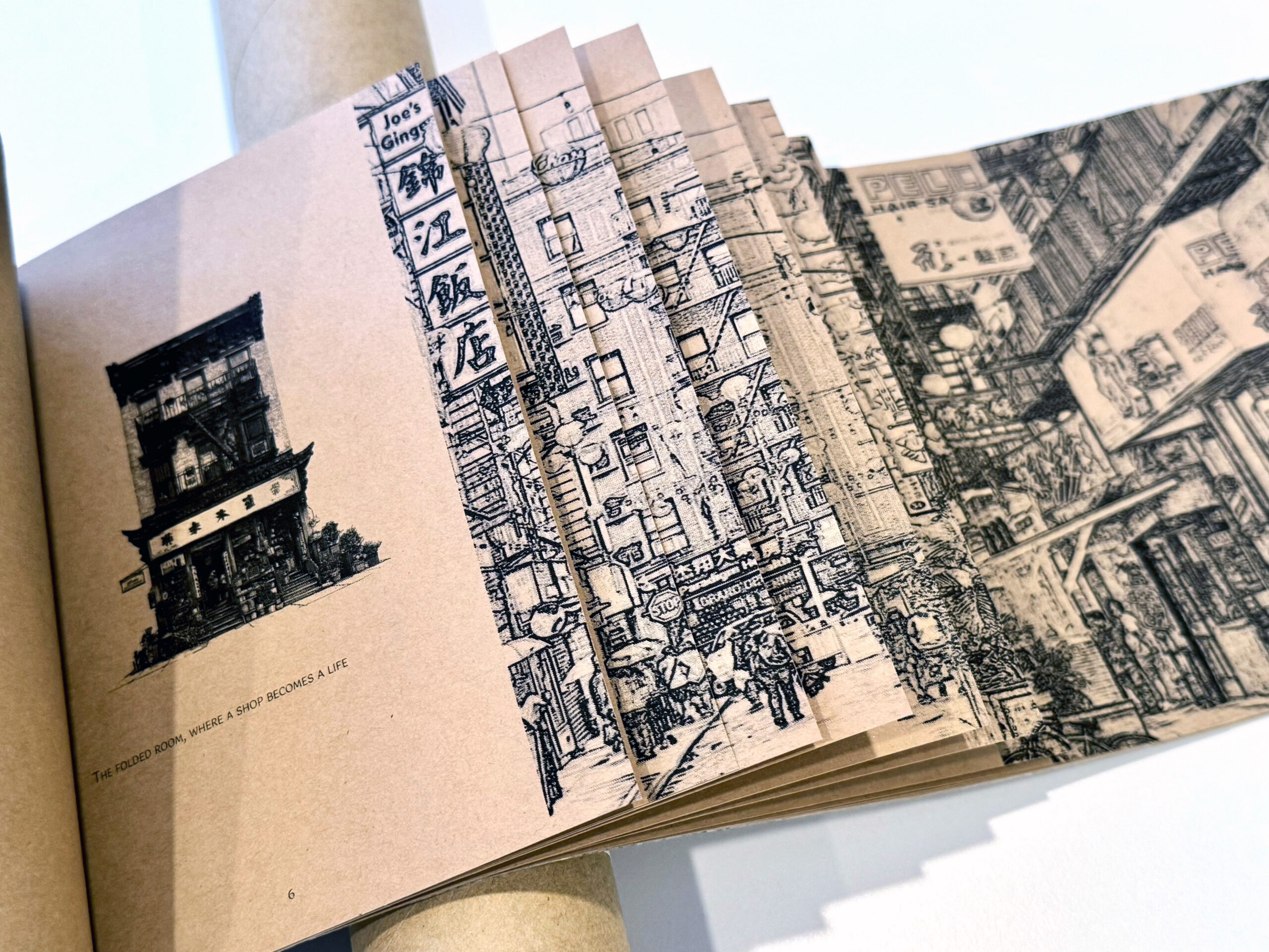 Made in traditional Chinese Longlin Juan (dragon-scale scroll) binding, the book unfolds twelve interlocking views into one folded neighborhood. Printed in deliberate black and white, it keeps the record steady while inviting participation. Readers can mark, color, and annotate as they move through the scroll, letting Chinatown take shape through attention.