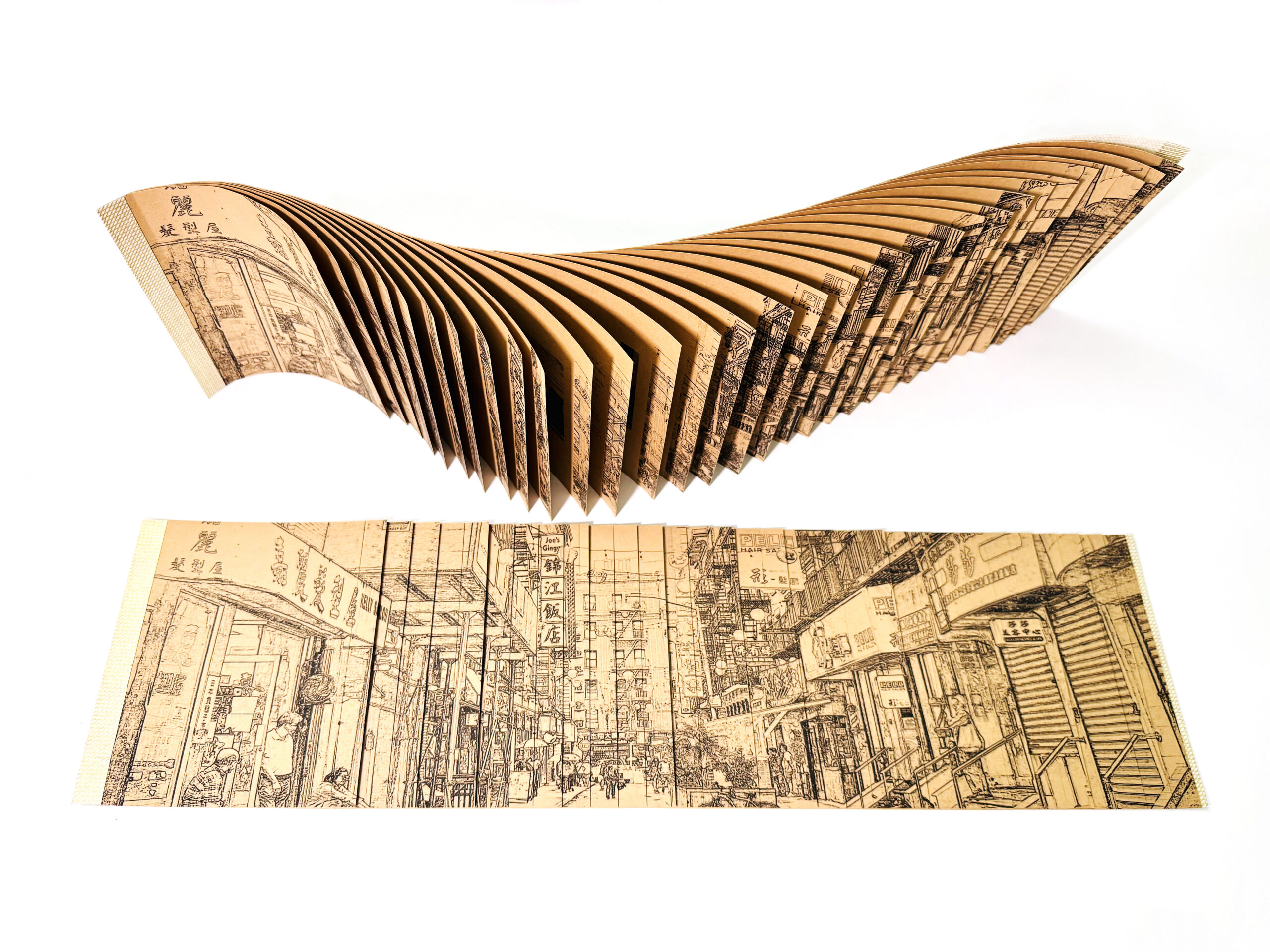 Inverted dragon-scale binding forms a scroll-like sequence, alternating poems with linocut-style illustrations across twelve Chinatown perspectives. The structure creates a tactile, kinetic reading experience shifting into a distinctive dynamic shape as it unfolds.