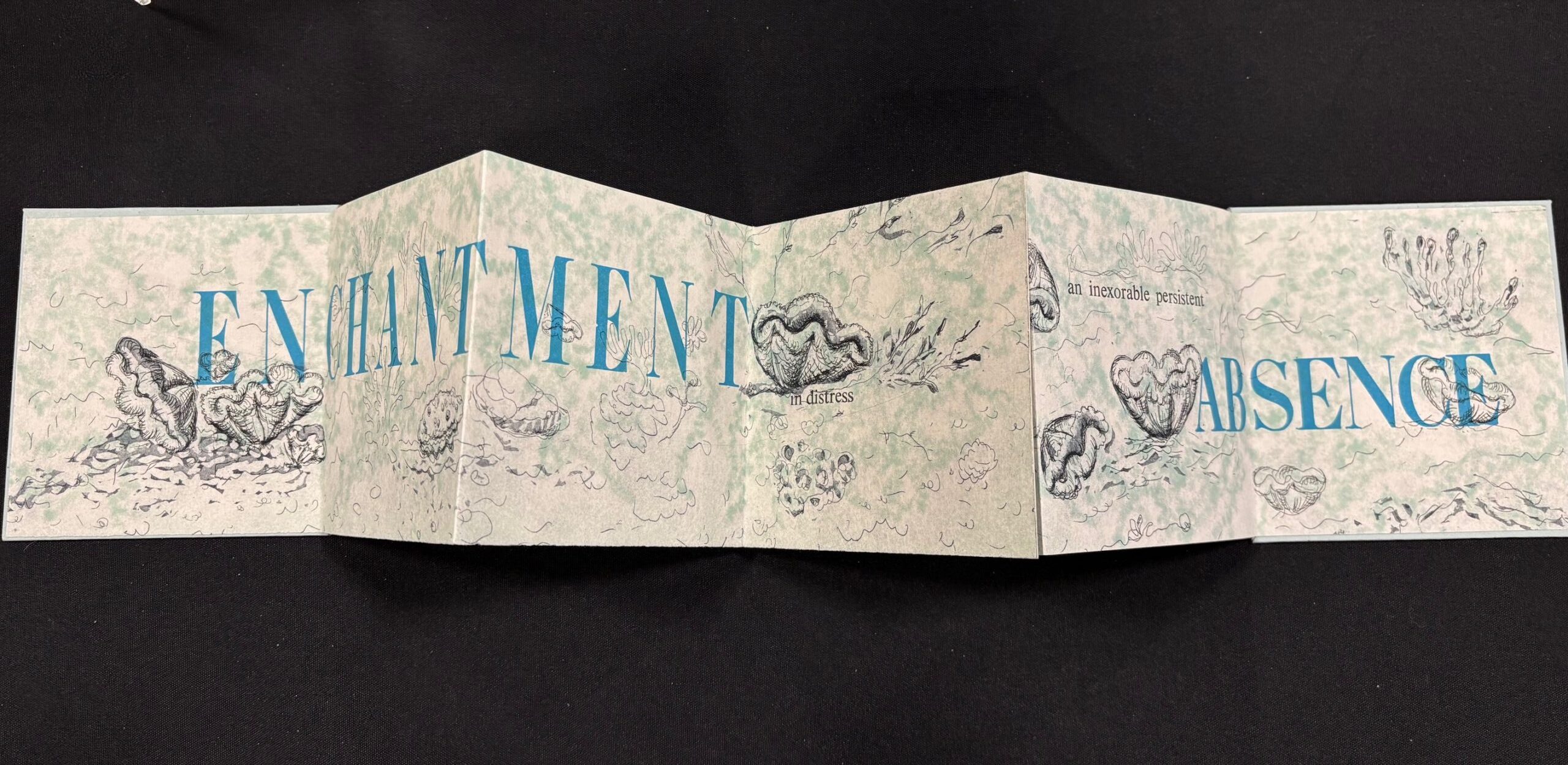 Absence features giant clams that are part of reef ecosystems. The text references my delight in the possibility of experiencing firsthand a colorful reef with red-lipped clams. Absence notes that this possibility is unlikely to occur given the enormous loss of coral reefs.