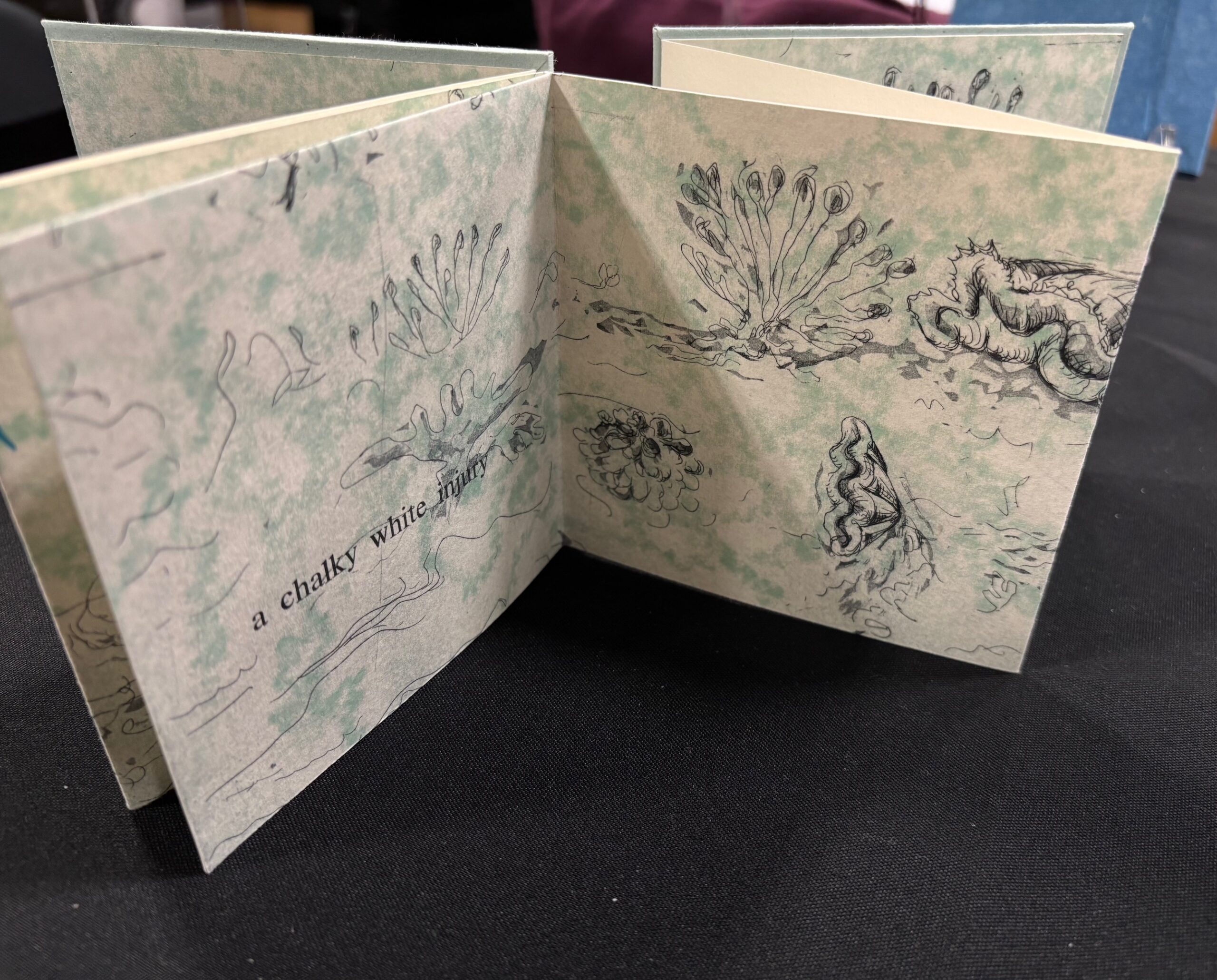 The book is a Plat 21 Tiny edition of four, drypoint, letterpress and pressure printing on Rives BFK.