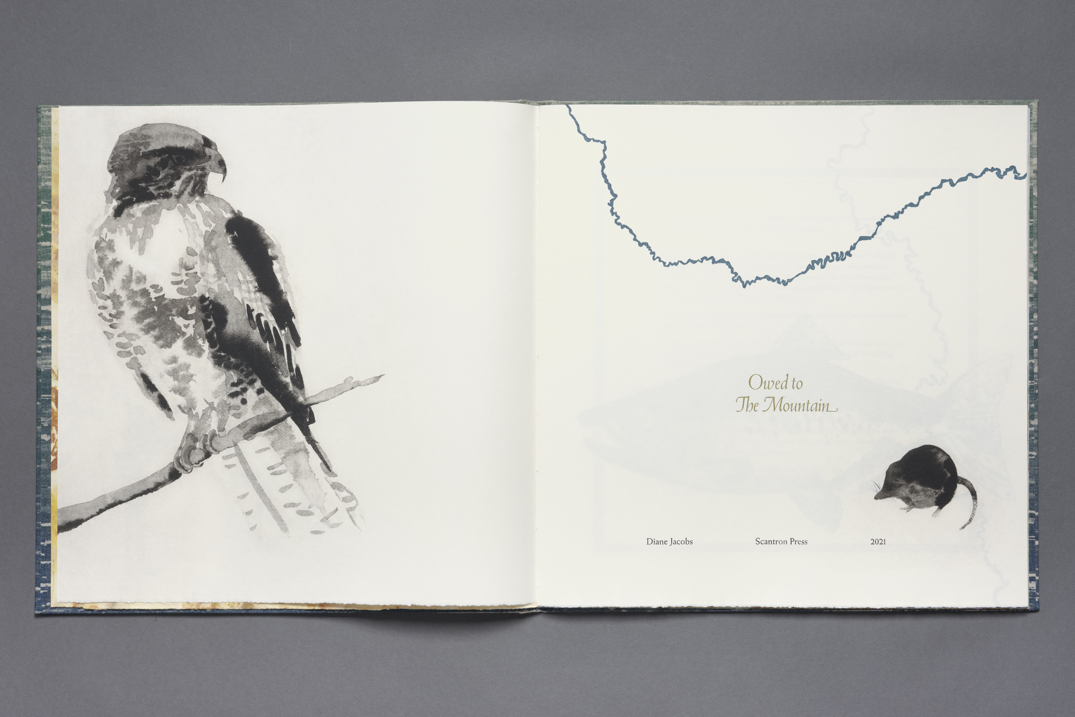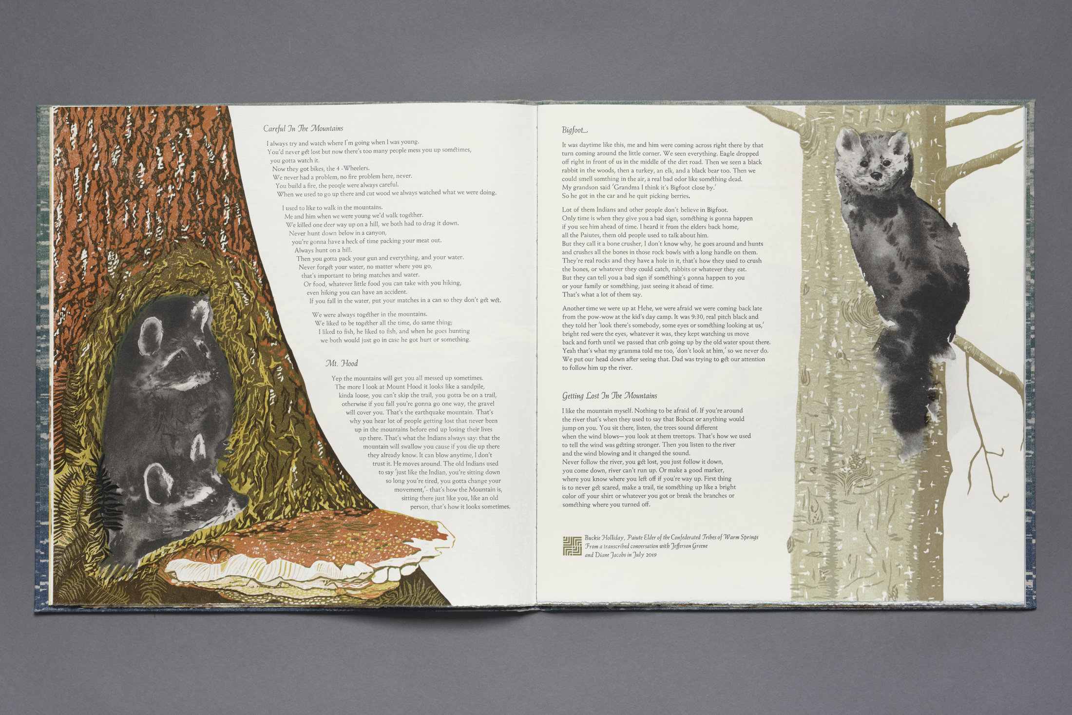 Owed to The Mountain is a sculptural artist book – the box unfolds one leaf at a time, to reveal each of the four directions. The Mountain is featured in four different printmaking techniques: West face – etching, North face – wood engraving, East face – lithograph, and South face – reduction woodcut. There are four linoleum cut river prints and three handset, letterpress-printed stories from the Confederated Tribes of Warm Springs. The box opens flat and in the center a paper mountain peeks through a cloud layer held up by five tree trunks. There are three handmade paper mountain skins nested inside one another. The outermost layer is made with celadonite pigment and accentuated with white ink exposing words. The middle surface details the dwindling glaciers and the innermost represents the volcanic strata. Beneath the mountain rests a fine press book. Animal ink drawings in colorful ecosystems and habitats appear among the text, documenting the changing seasons. The stories weave multiple Native voices that underscore the value of friendship, reciprocity, interdependence, and cooperation.
