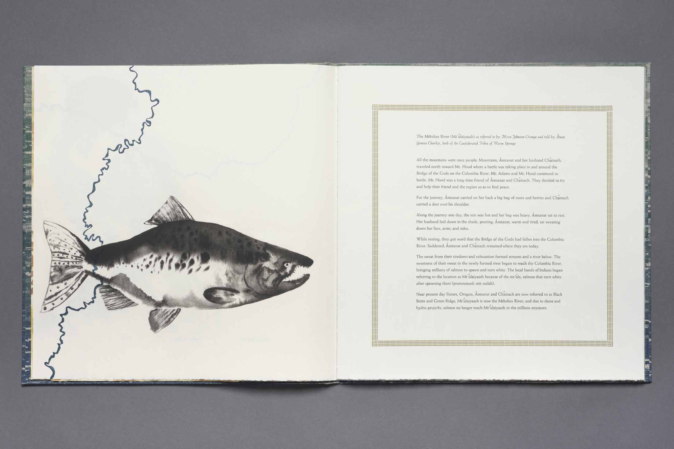 Materials and printmaking techniques for the fine-press book include solar etching plates developed from Sumi ink animal drawings, a monoprint centerfold, a water motif silkscreen printed on book cloth for the hard covers, end sheets made from eco-printing plants found on Mt. Hood, habitats created from pressure printing and reduction woodcuts, and stories handset in Weiss foundry type (Roman and italic 12 pt., 14 pt., and 18 pt.) and printed letterpress. Book pages are Zerkall paper, end pages are Rives lightweight, and the beaver and river otter were printed on mulberry paper and adhered to the inside covers.