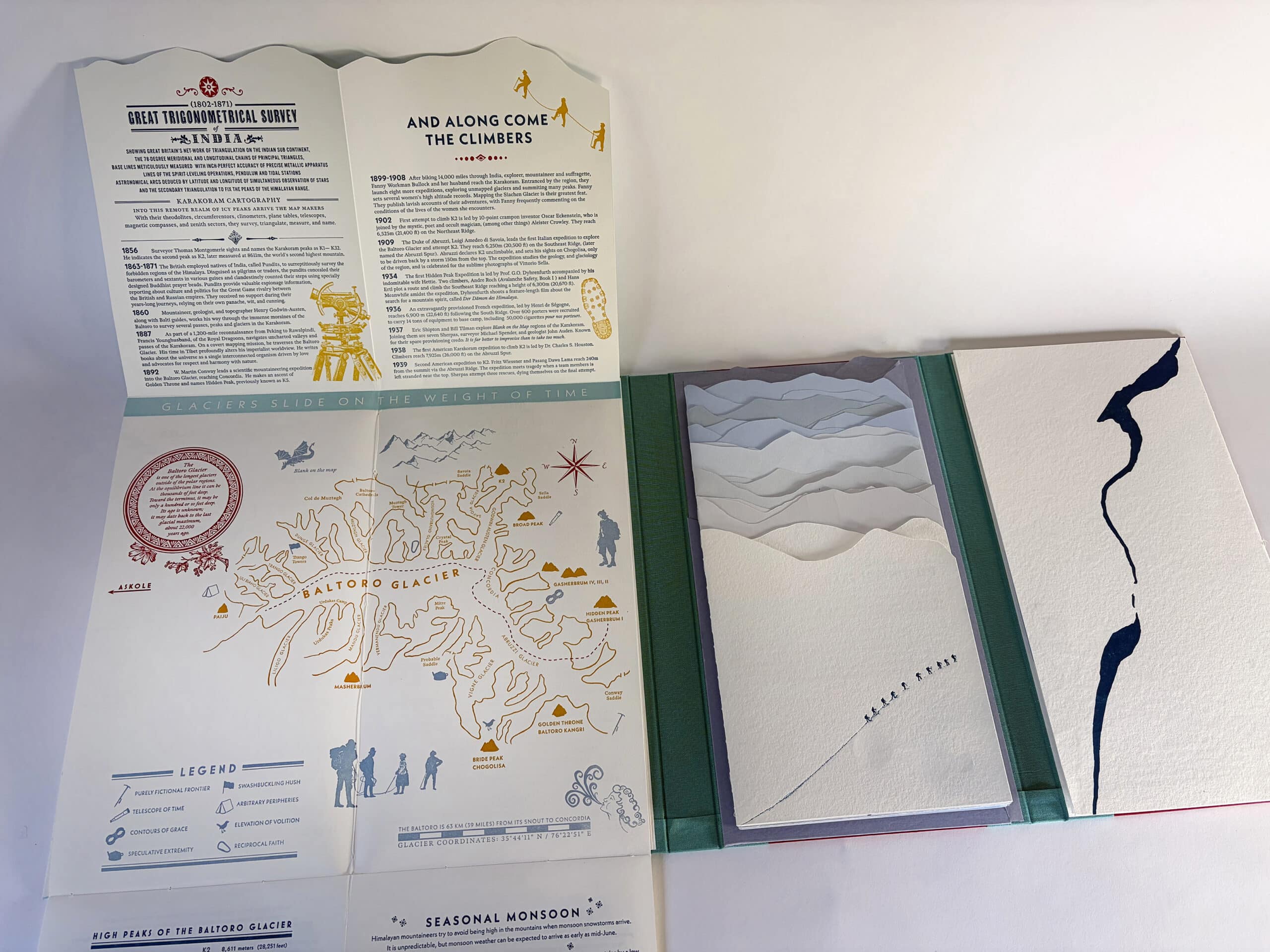 To reach the base of Hidden Peak the expedition must travel hundreds of miles on foot through the valleys of Kashmir and up the Baltoro Glacier. Maps, historical and scientific research provide context for the story. This book considers the nature of a glacier with its ageless layers of slow-moving ice and debris and its perilous crevasses. The Pilgrims’ tales explore the dynamic relationship of human nature and forces of nature.