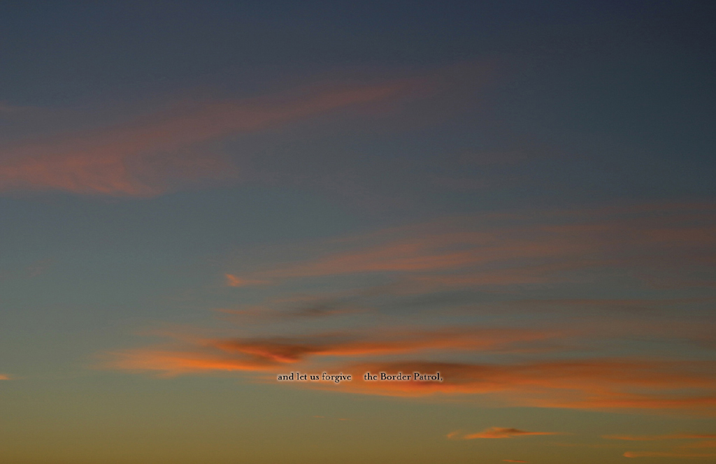 Sanctus Sonorensis is a book of border ‘beatitudes’. This work comments on the complicated attitudes of Americans on illegal immigration from Mexico. The cover shows a photograph of the area of Southern Arizona which is the most active in terms of migration across the Sonoran desert, and where thousands have lost their lives in the deadly desert heat. The interior pages show the progression of a typical high-desert day from dawn to sunset, mimicking the sky above an immigrant during a day’s desert passage, and accompanied by a single line of text on each two-page spread.