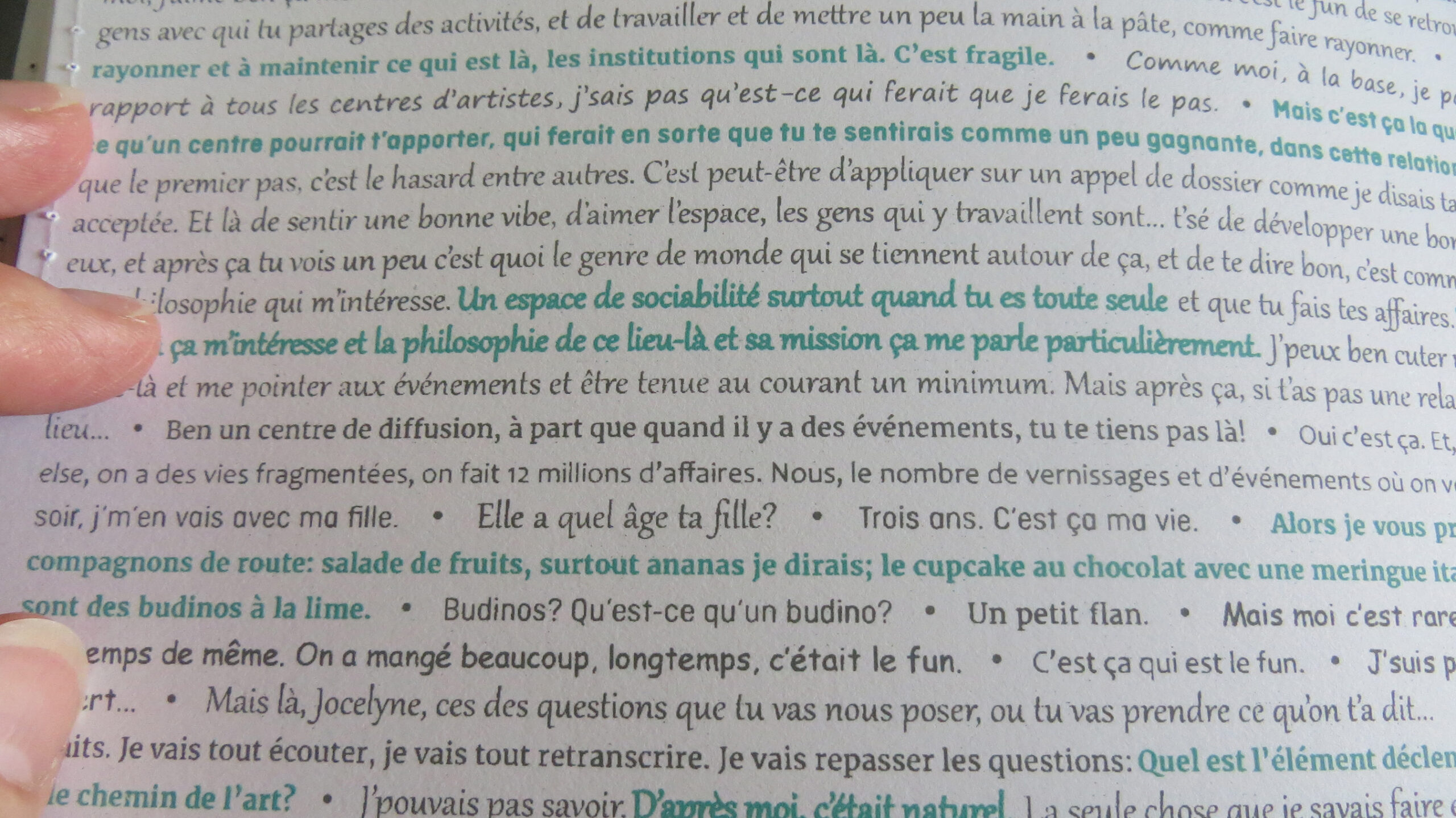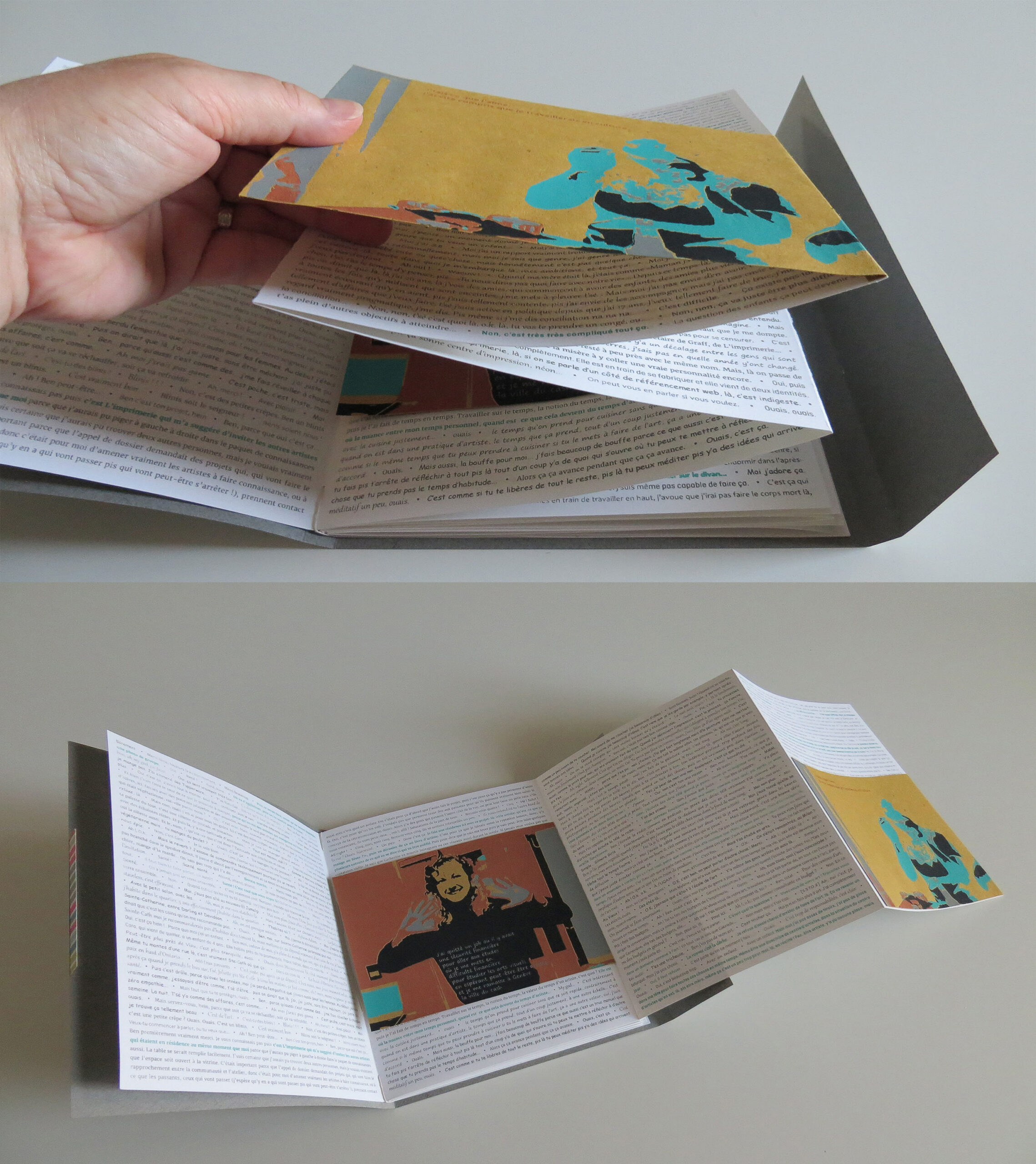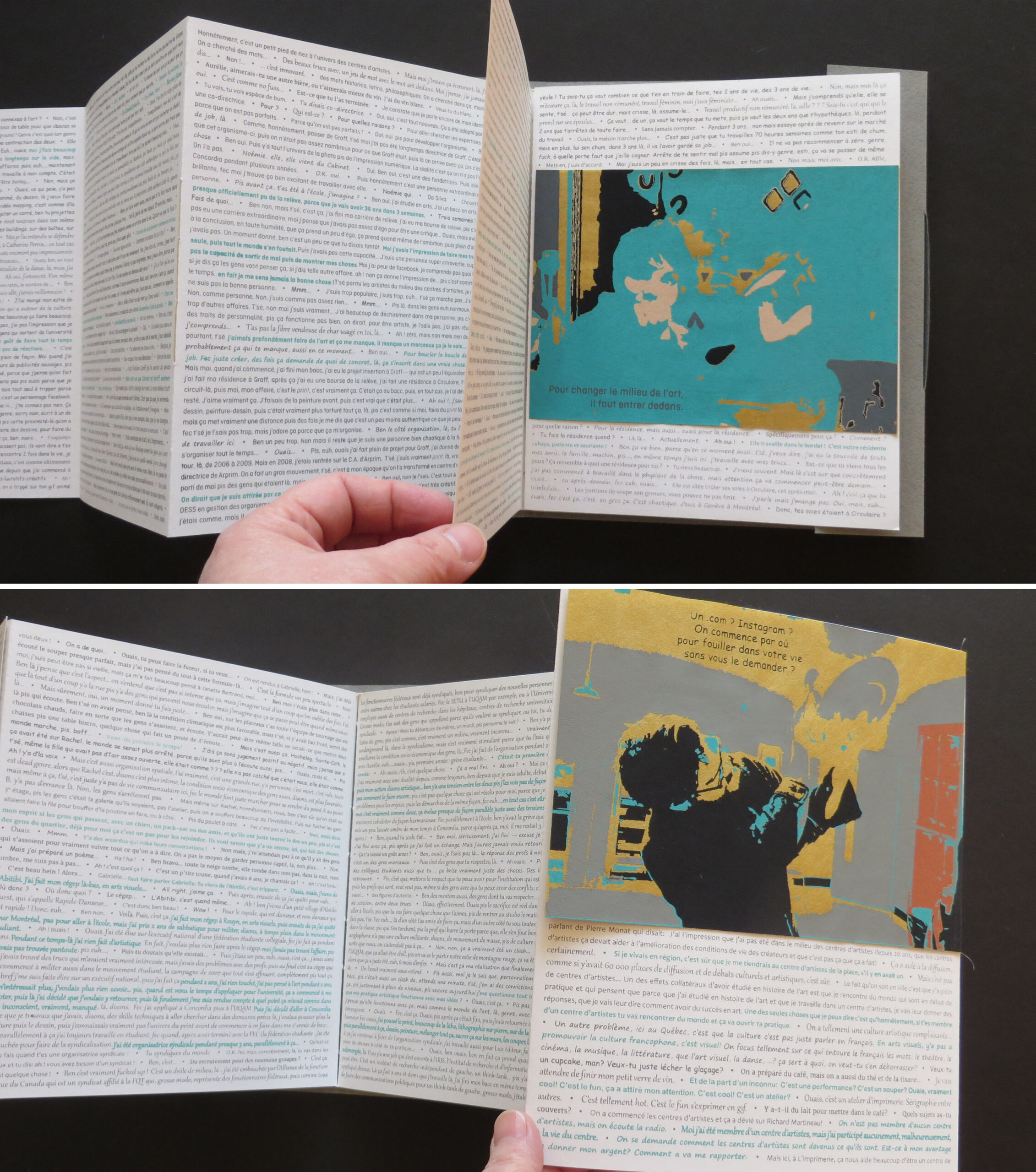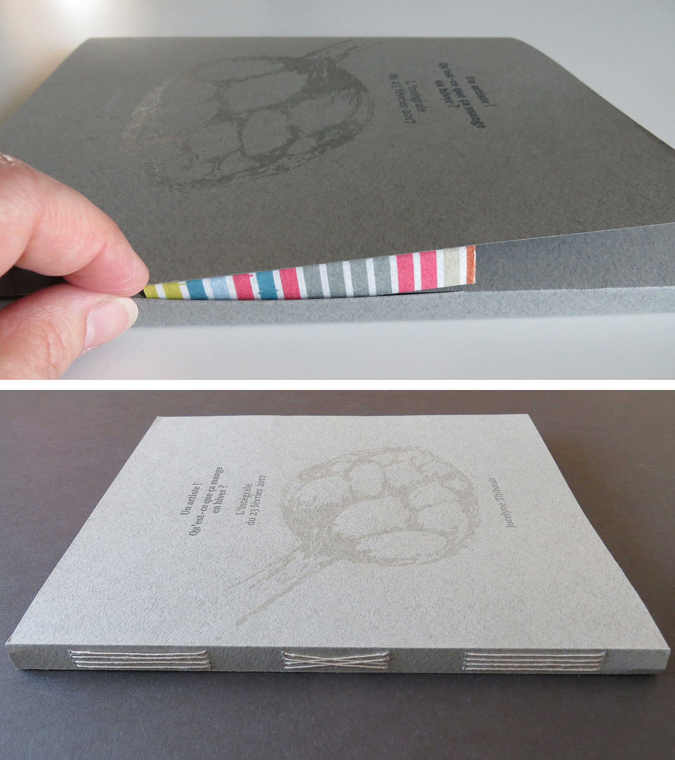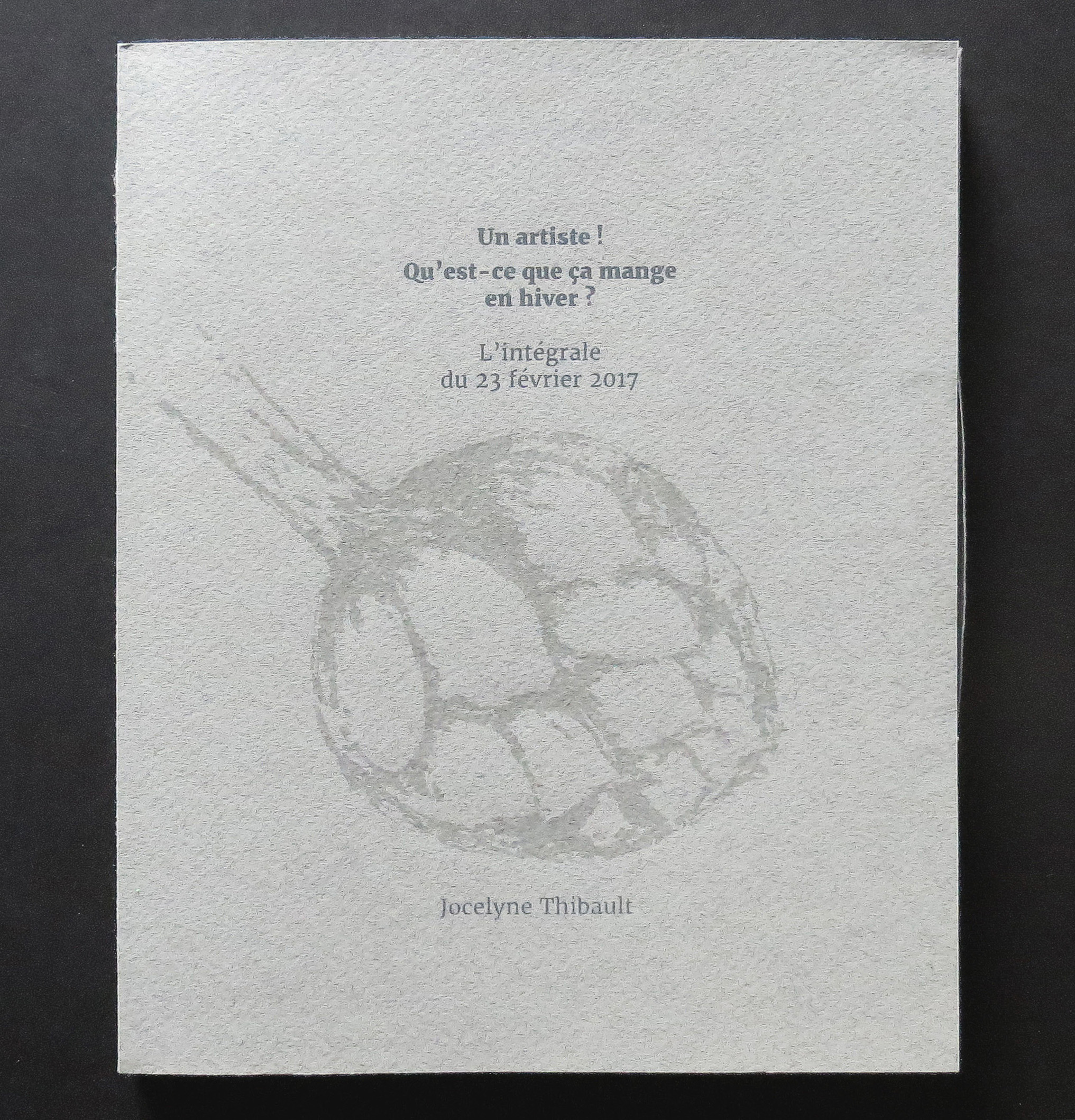 This artist’s book was created following a “showcase dinner” bringing together six artists and cultural workers (Gabrielle Brais Harvey, Aurélie Dubois, Martin Lachapelle-Babineau, Catherine Melançon, Geneviève Turcotte and Jocelyne Thibault). The event was held in the front window of L’imprimerie, centre d’artistes (artists run center). Their conversation was broadcast simultaneously outside the center, on Sainte-Catherine Street (Montreal) with the aim of popularizing their practices to a strolling public. The book presents the entirety of their exchanges, in a cross-pollination of ideas and reflections. A different typography is assigned to each person, which allows the rhythm of the conversation to be visually captured. A simple dot interrupts here and there the flow of the conversation, and sometimes the idea of the person speaking follows a few lines further. This gathering was a performative act where the artist Jocelyne Thibault explored the process of getting to know each other by adopting the position of the host who receives distinguished guests. The artist prepared and served the meal in an atmosphere that was intended to be friendly and relaxed. She thus questions the value of the same domestic act, whether it comes from a daily task amongst family duties or is part of an artistic posture. The title Un artiste! Qu’est-ce que ça mange en hiver? is a French expression intended to question the meaning of things.
