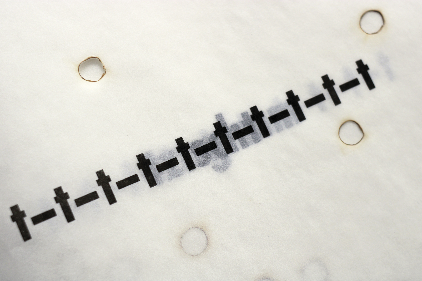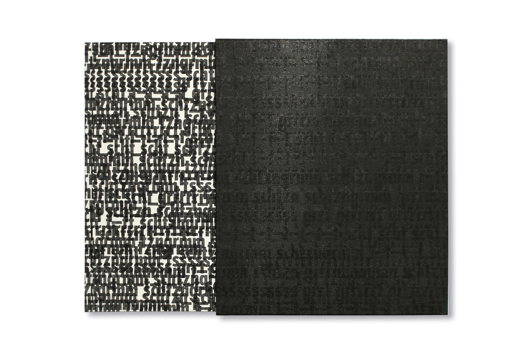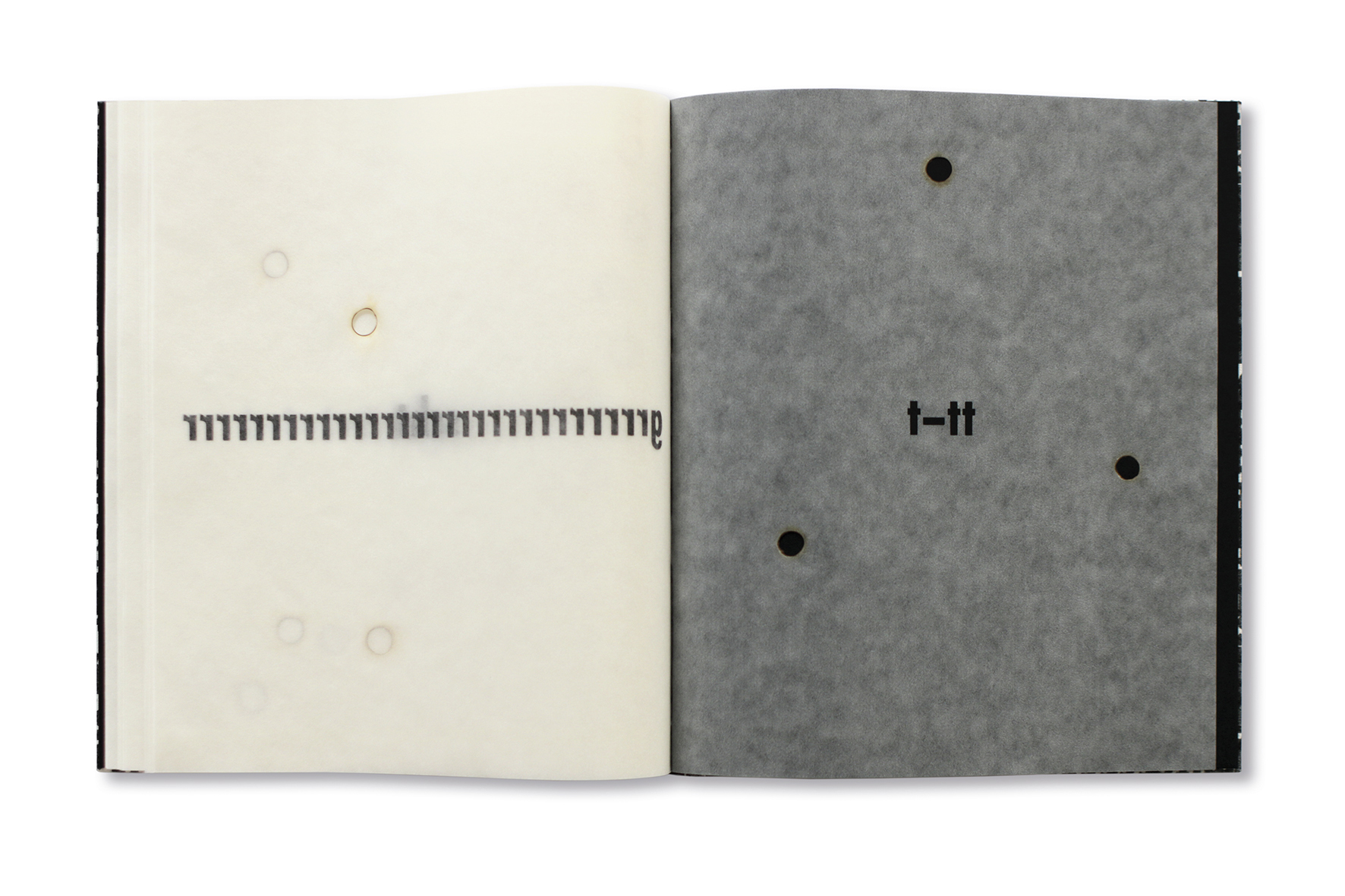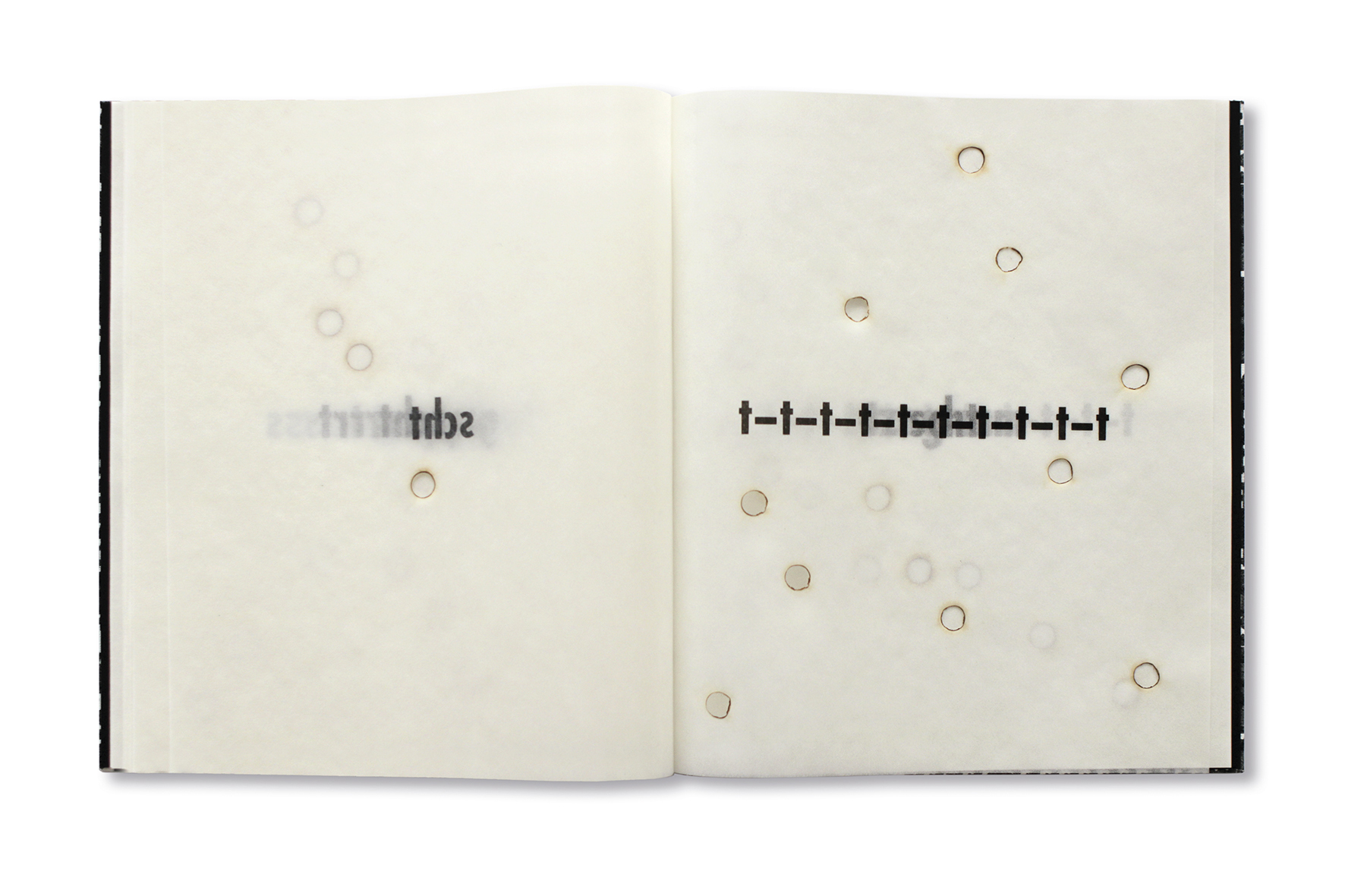 This poem consists entirely of the word “Schützengraben” (trench); in the Viennese dialect, when all of the vowels are removed, it becomes “schtzngrmm.” The consonants rearrange themselves into new syllables that evoke machine-gun volleys and grenade strikes, painting an onomatopoetic picture of trench warfare. The text belongs to the tradition of concrete poetry and sound poetry and is one of the antiwar poems of the 1960s. “schtzngrmm / schtzngrmm / t–t–t–t / t–t–t–t / grrrmmmmm / t–t–t–t / s–––––––––c–––––––––h / tzngrmm / tzngrmm / tzngrmm / grrrmmmmm / schtzn / schtzn / t–t–t–t / t–t–t–t / schtzngrmm / schtzngrmm / tssssssssssssss / grrt / grrrrrt / grrrrrrrrrt / scht / scht / t–t–t–t–t–t–t–t–t–t / scht / tzngrmm / tzngrmm / t–t–t–t–t–t–t–t–t–t / scht / scht / scht / scht / scht / grrrrrrrrrrrrrrrrrrrrrrrrrrrrr / t–tt” The 35 lines of the poem are distributed across the pages of the book. Each page has only one line. Because of the transparency of the glassine paper, the previous and subsequent lines show through. The text is reversed on each left-hand page, and legible on each right-hand page. By choosing a sans serif font (Futura Bold Condensed) the lower case letters “t” are reminiscent of the crosses of fallen soldiers.